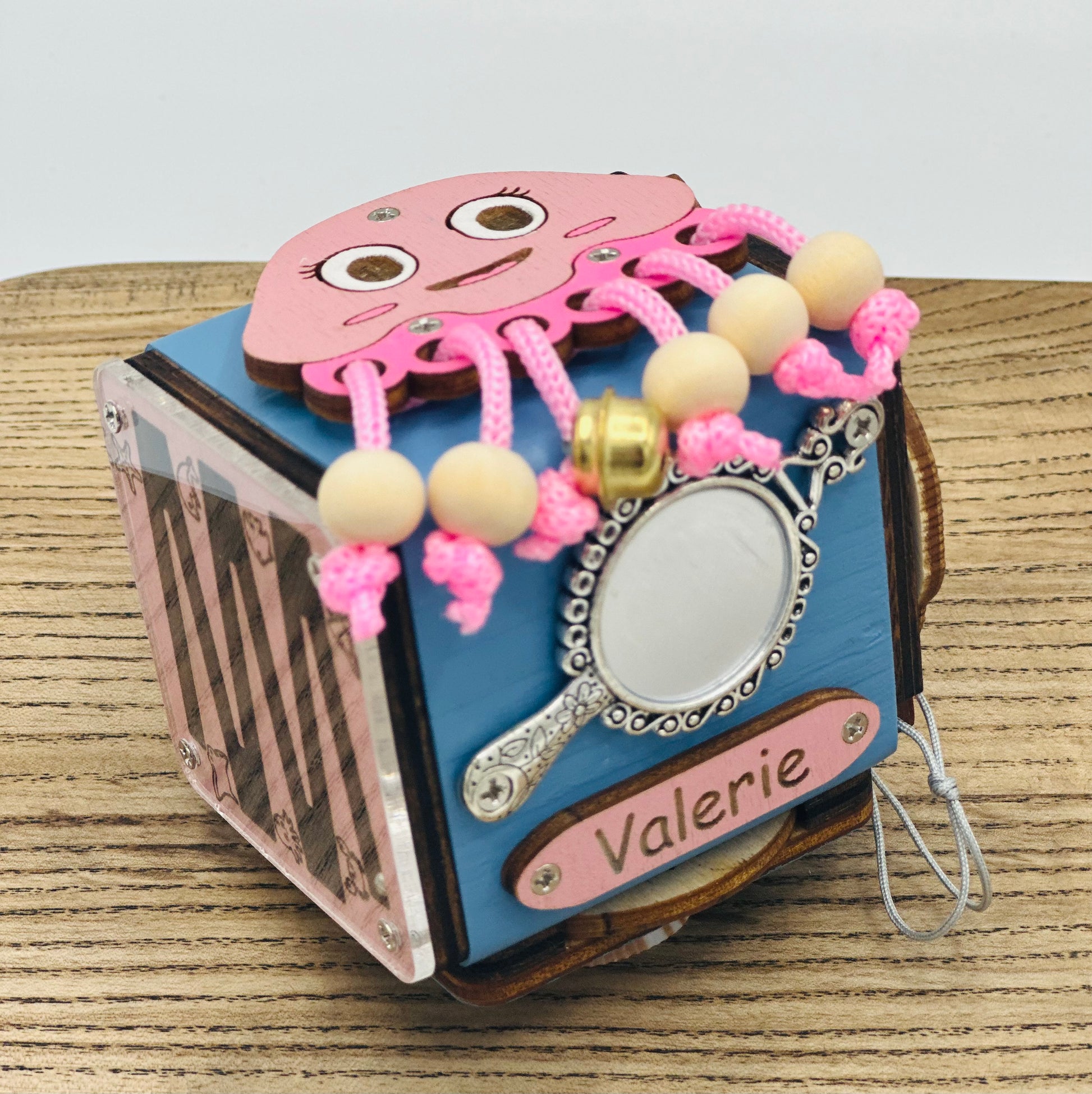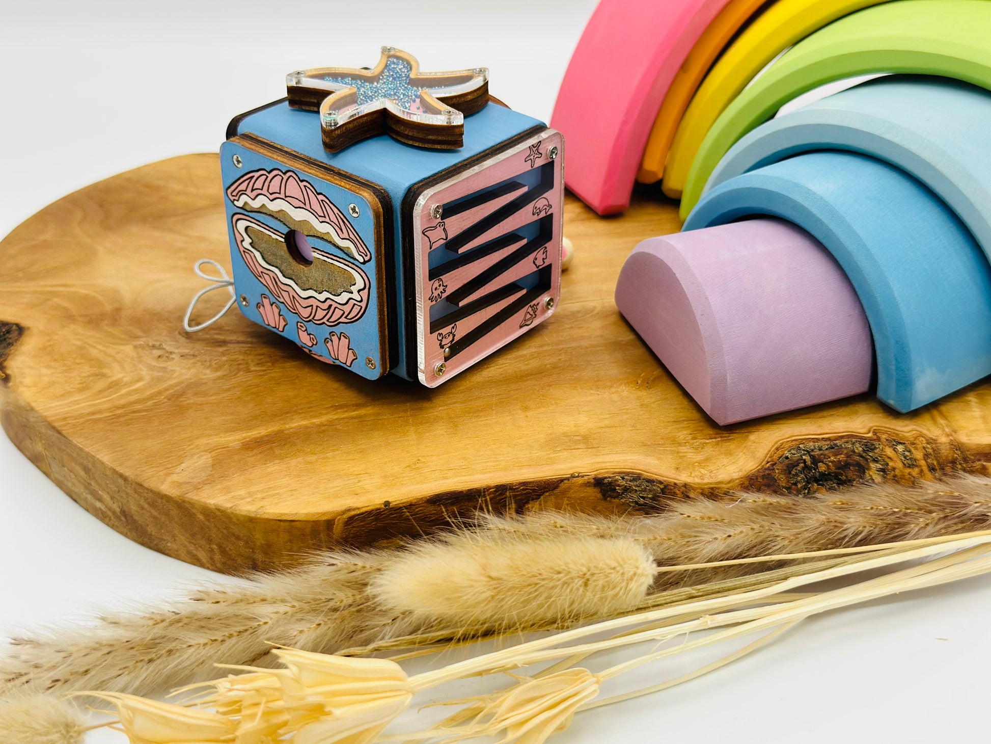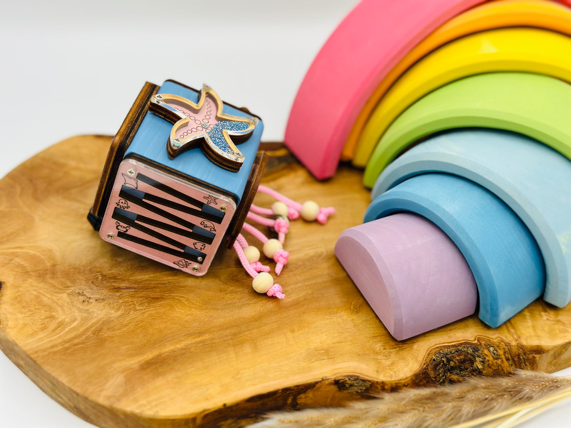 Unser Busycube, auch als Motorikwürfel bekannt, ist ein pädagogisch-wertvolles Lernspielzeug für Babys und Kleinkinder.