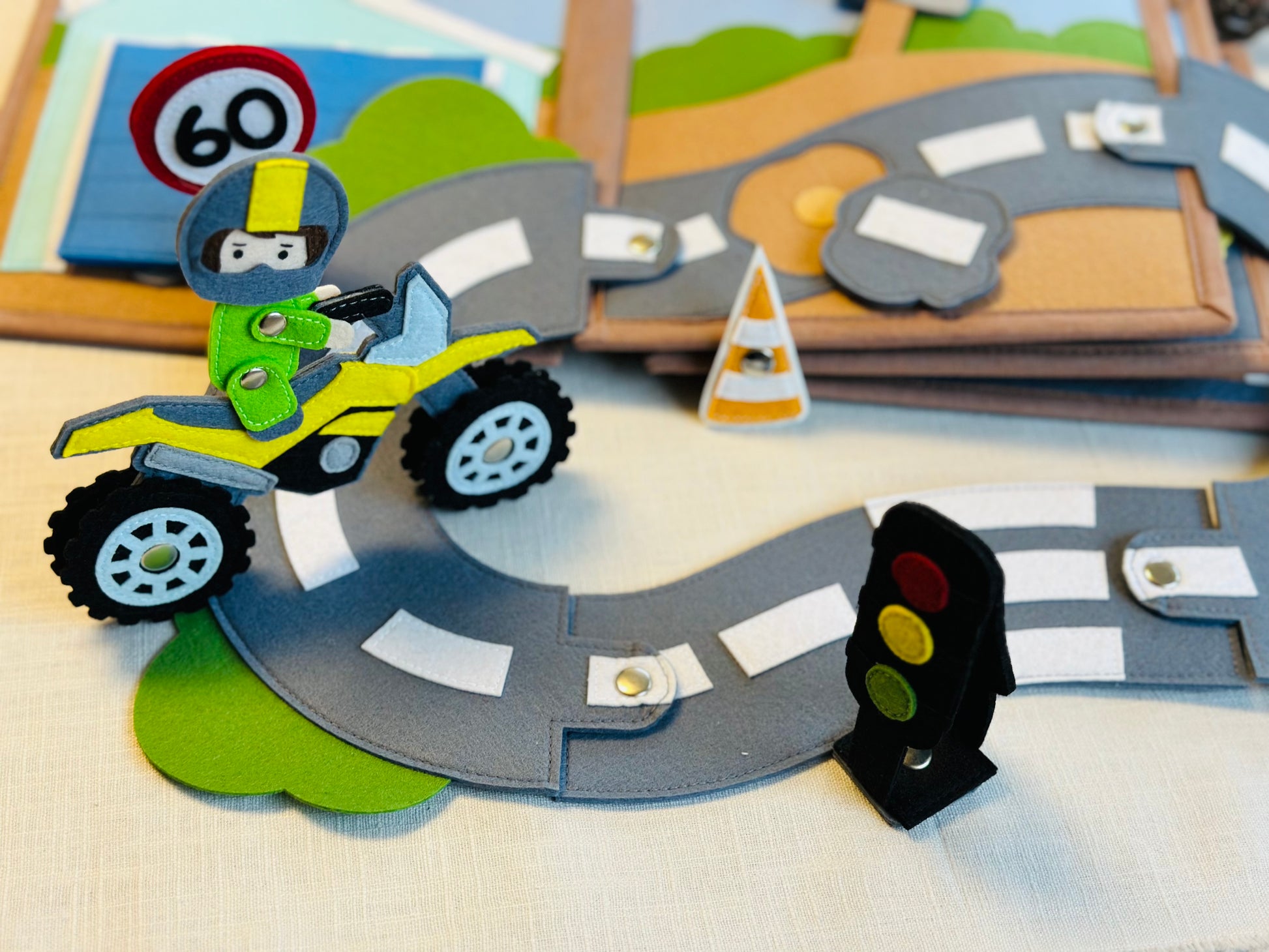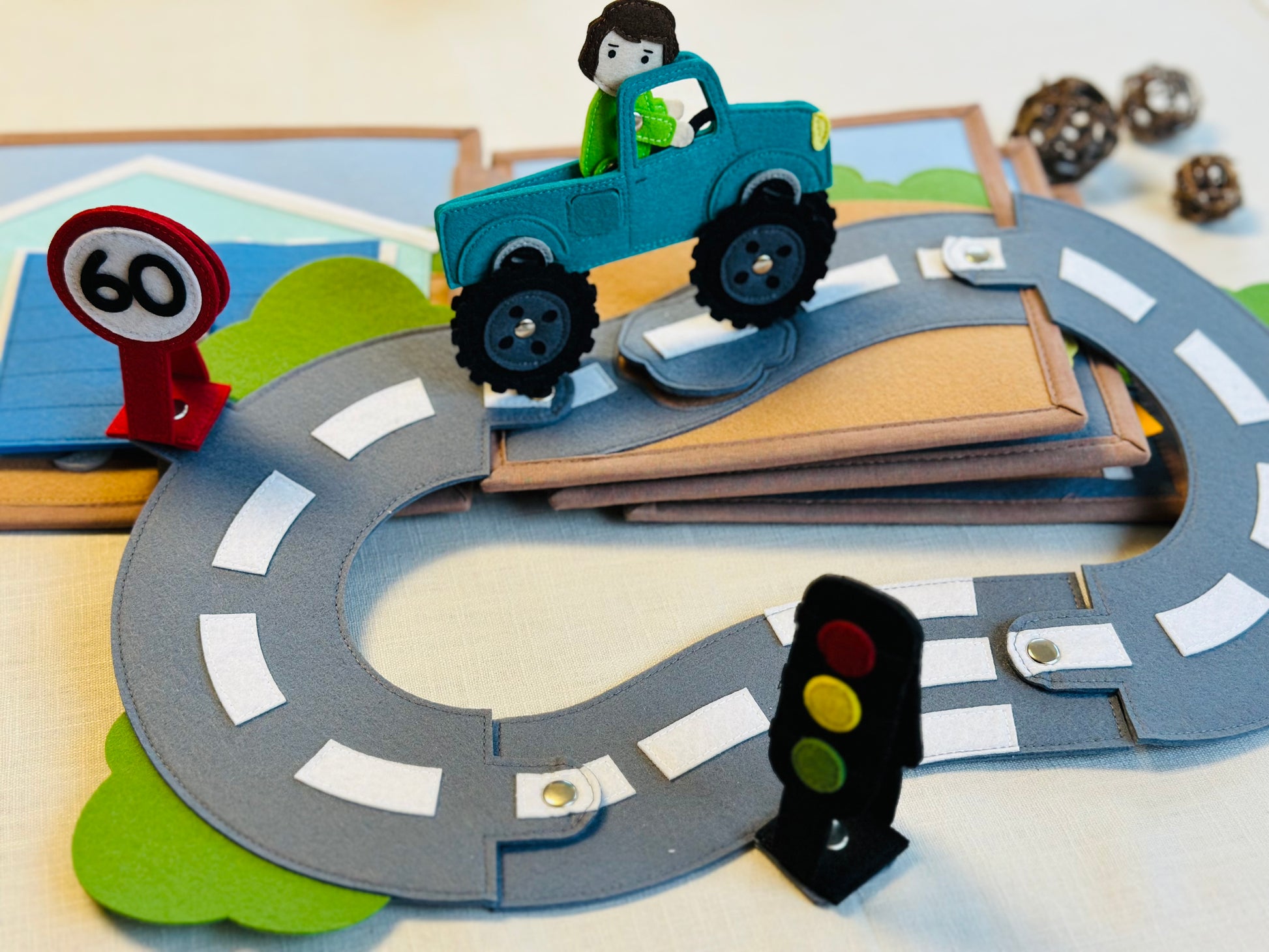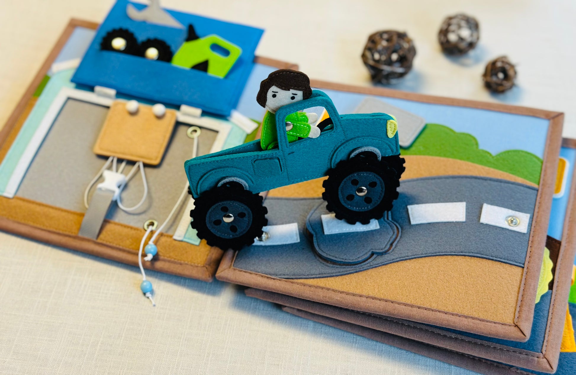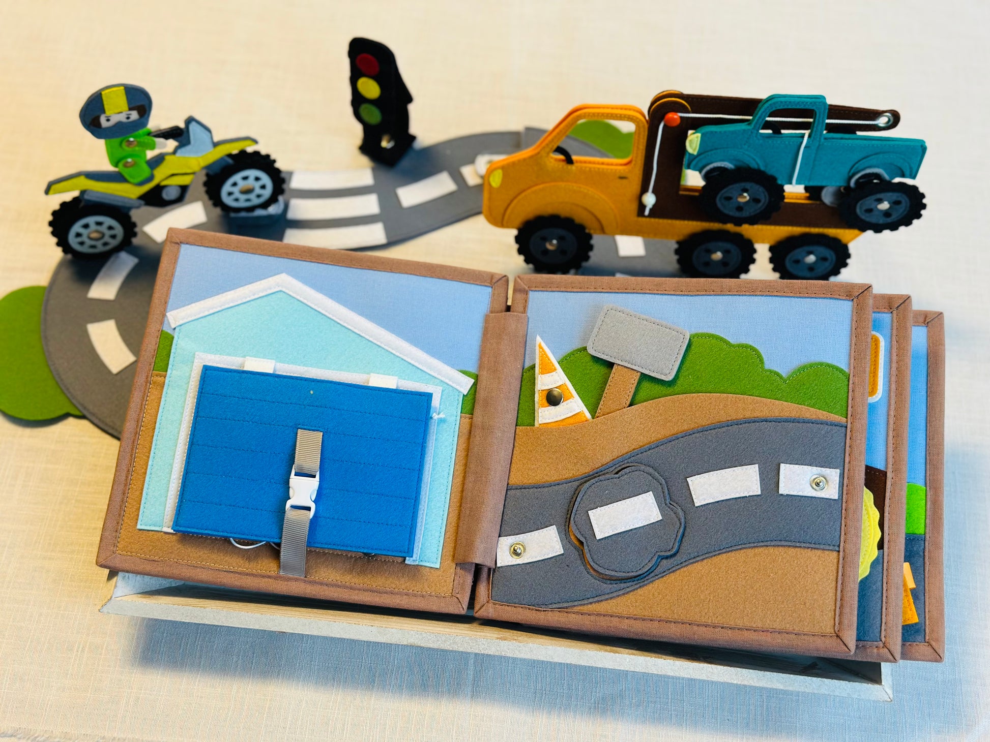 Das Quiet Book „Gute Fahrt!“ bietet zahlreiche Aktivitäten zur Förderung der kognitiven Fähigkeiten und der Kreativität.