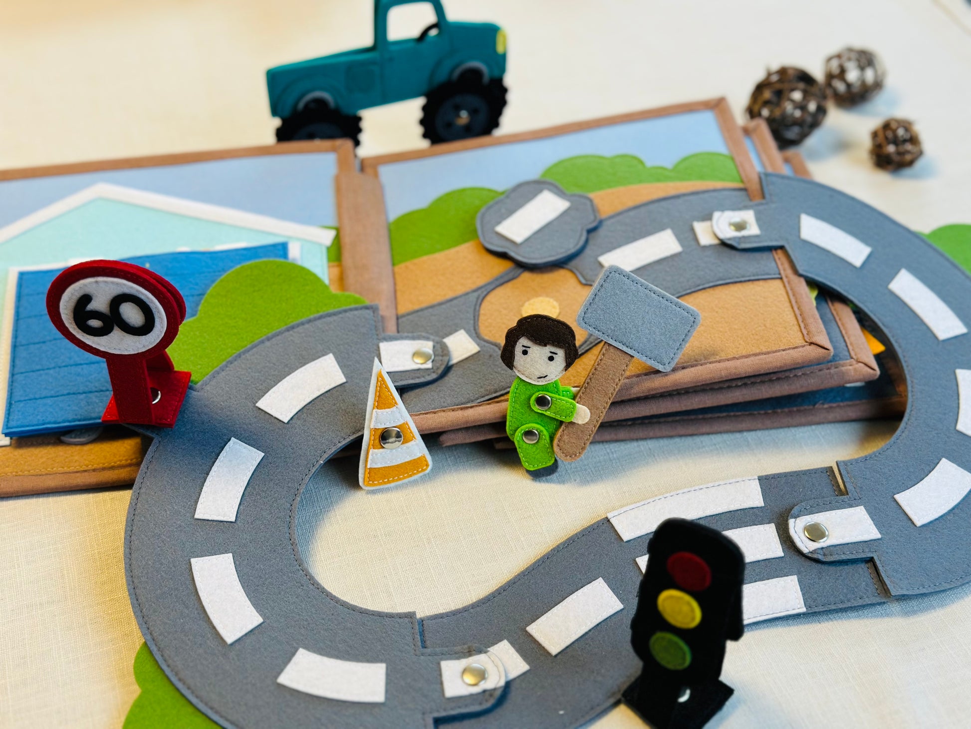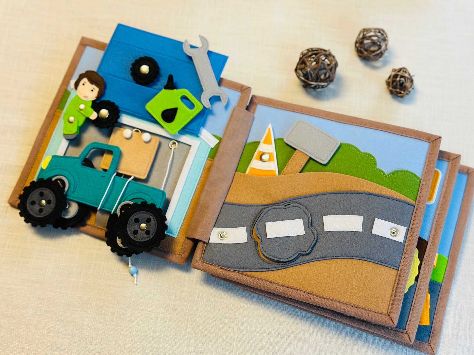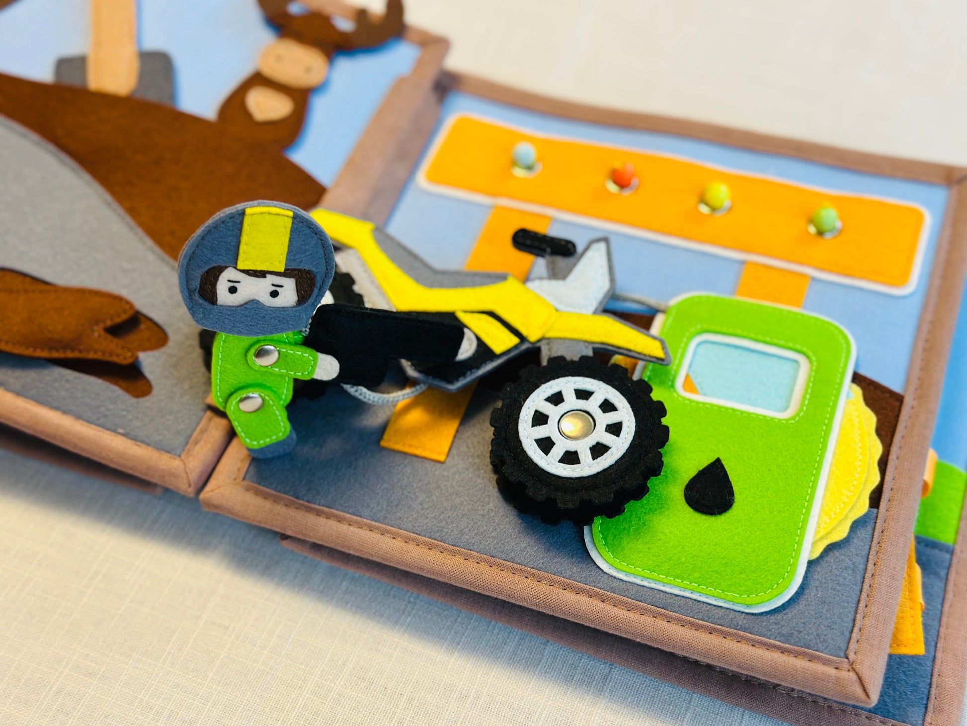Das Quiet Book „Gute Fahrt!“ bietet zahlreiche Aktivitäten zur Förderung der kognitiven Fähigkeiten und der Kreativität.
