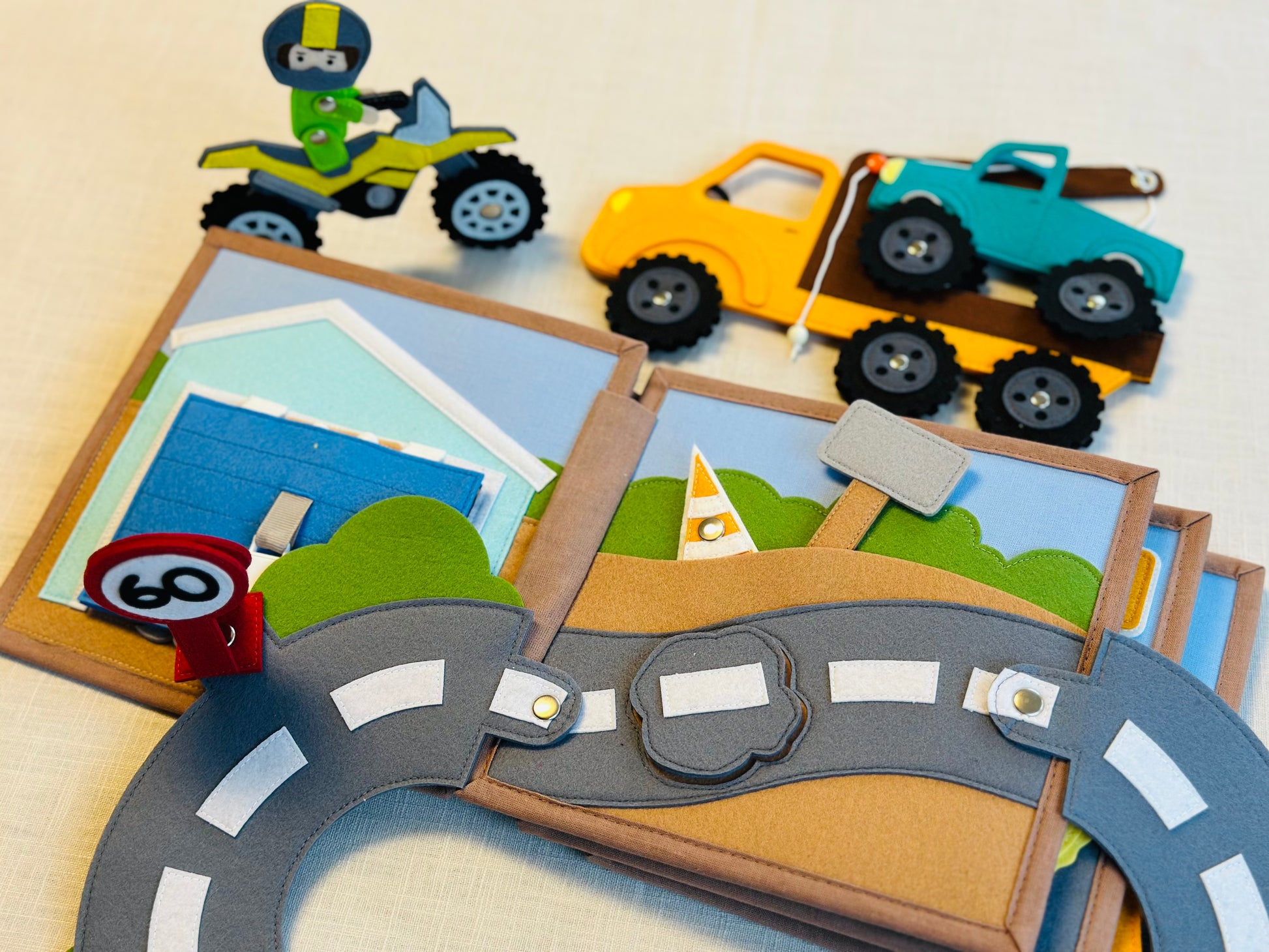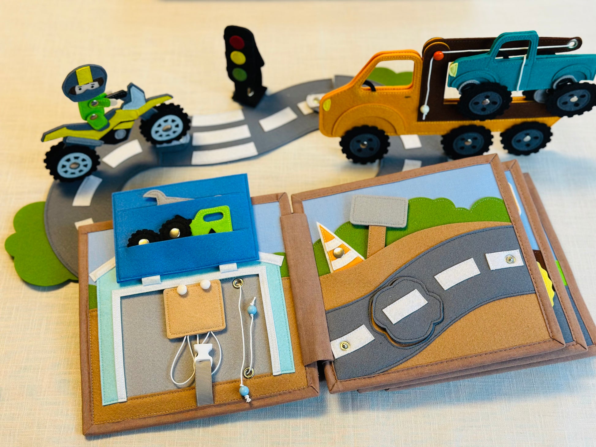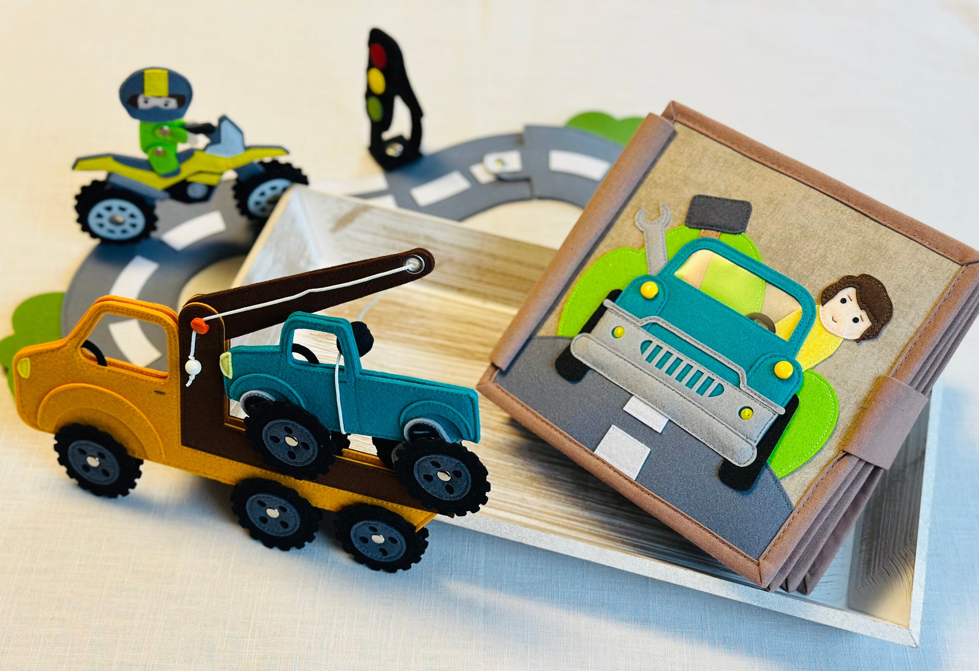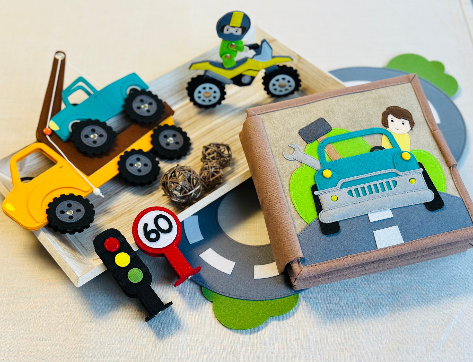 20x20 cm mit viel Zubehör (Geländewagen, Motorrad, Abschleppwagen, Autostraße aus Filz, Filztiere, Werkzeug und viel mehr)