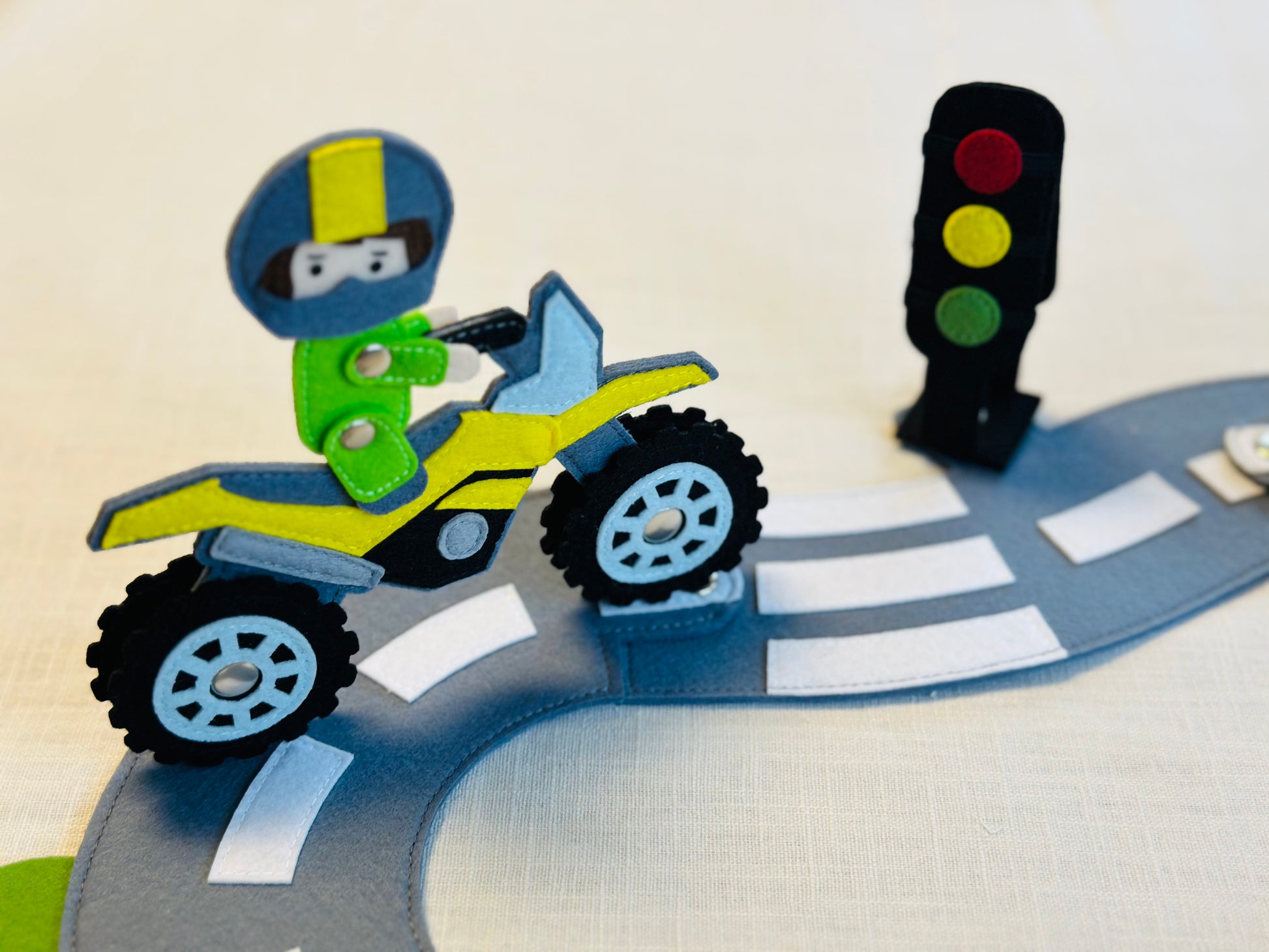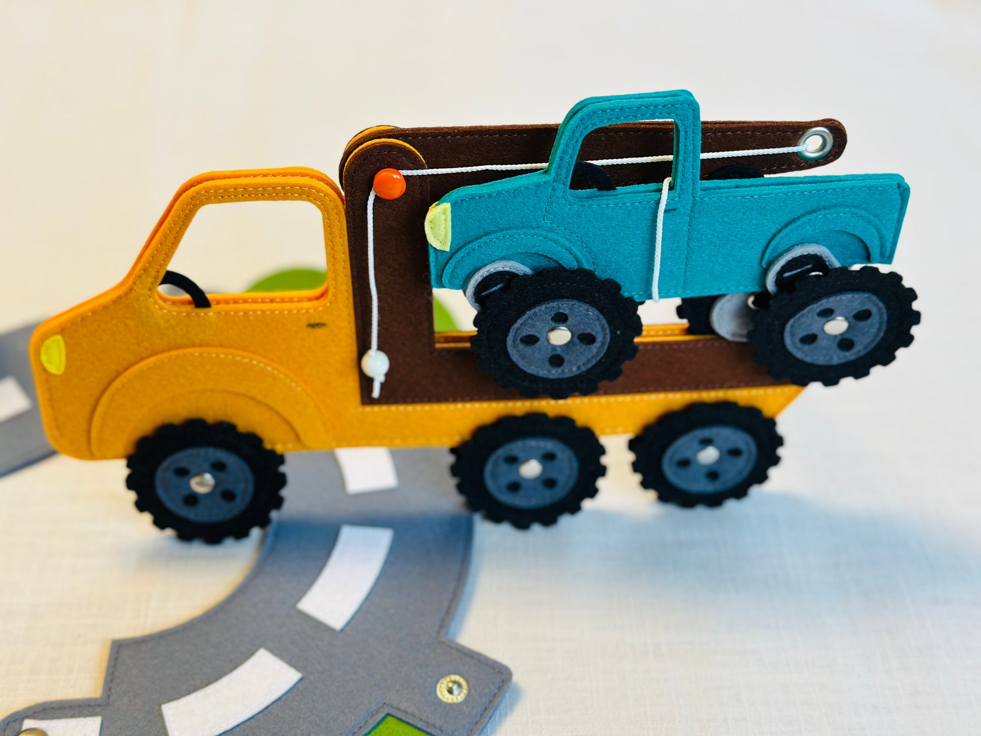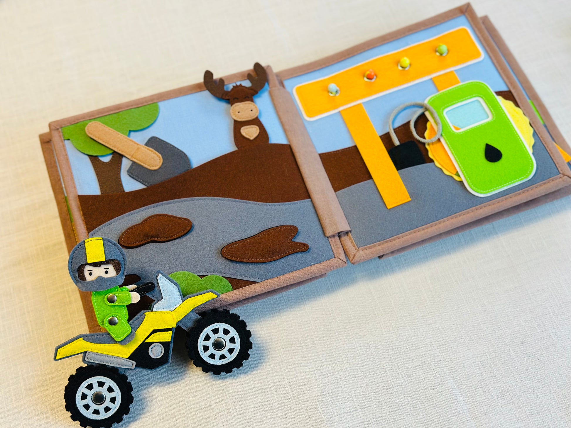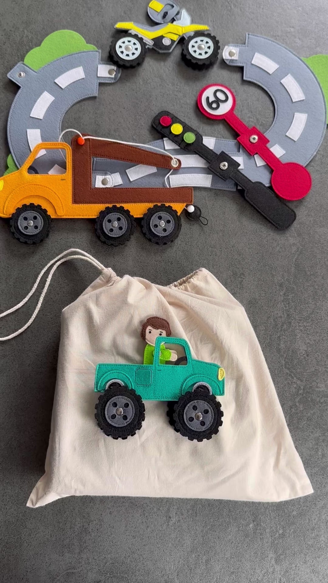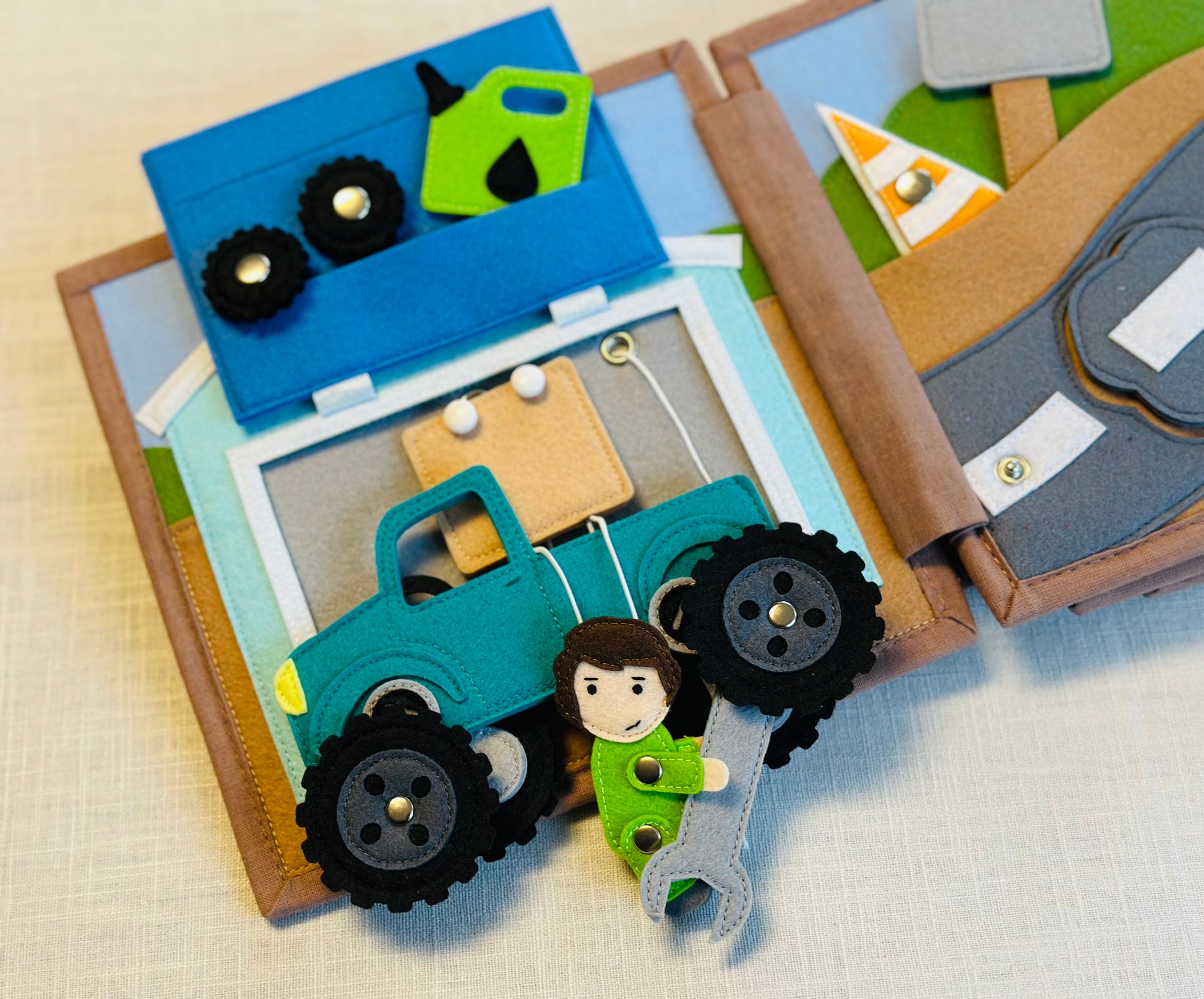 20x20 cm mit viel Zubehör (Geländewagen, Motorrad, Abschleppwagen, Autostraße aus Filz, Filztiere, Werkzeug und viel mehr)