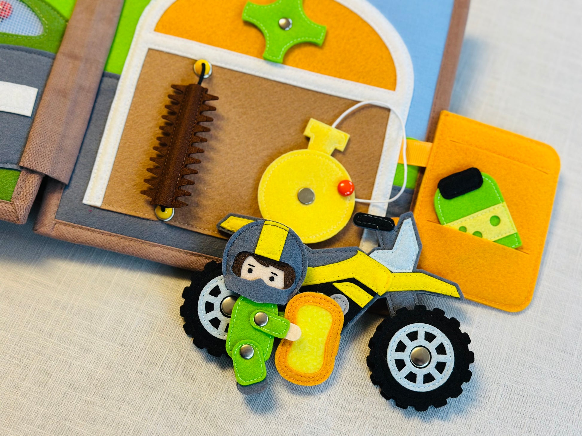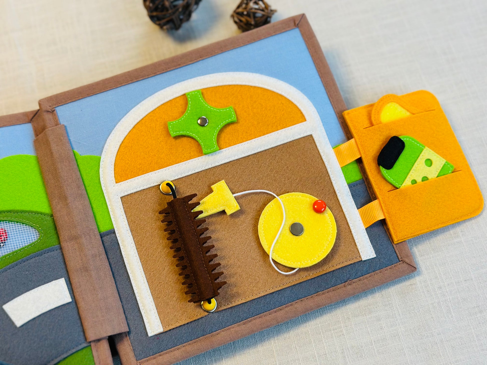 Dieses Beschäftigungsbuch ist das ideale Spielzeug für ruhige Momente. Es hilft, die Aufmerksamkeit zu fokussieren und sorgt für eine ruhige Unterhaltung.