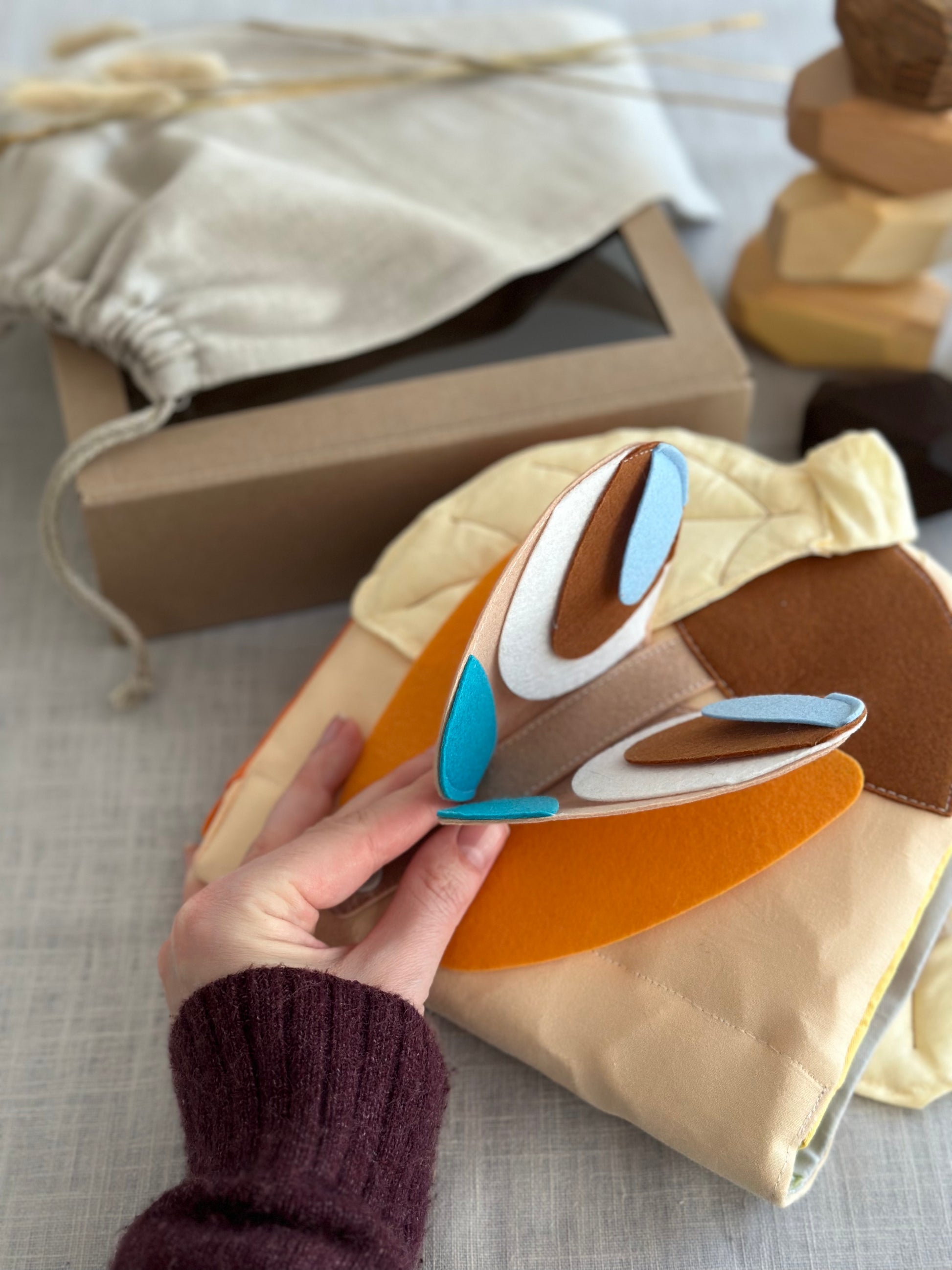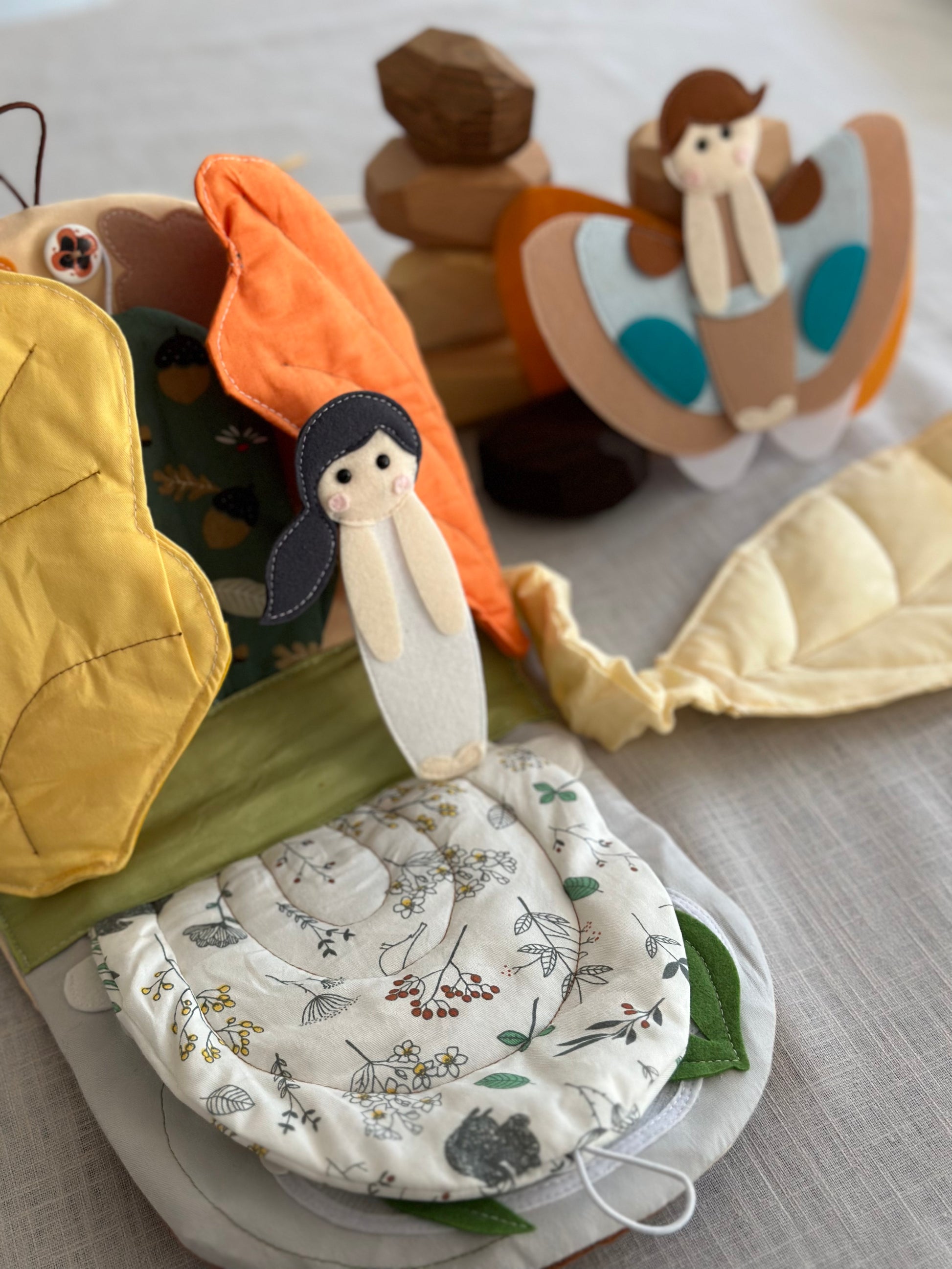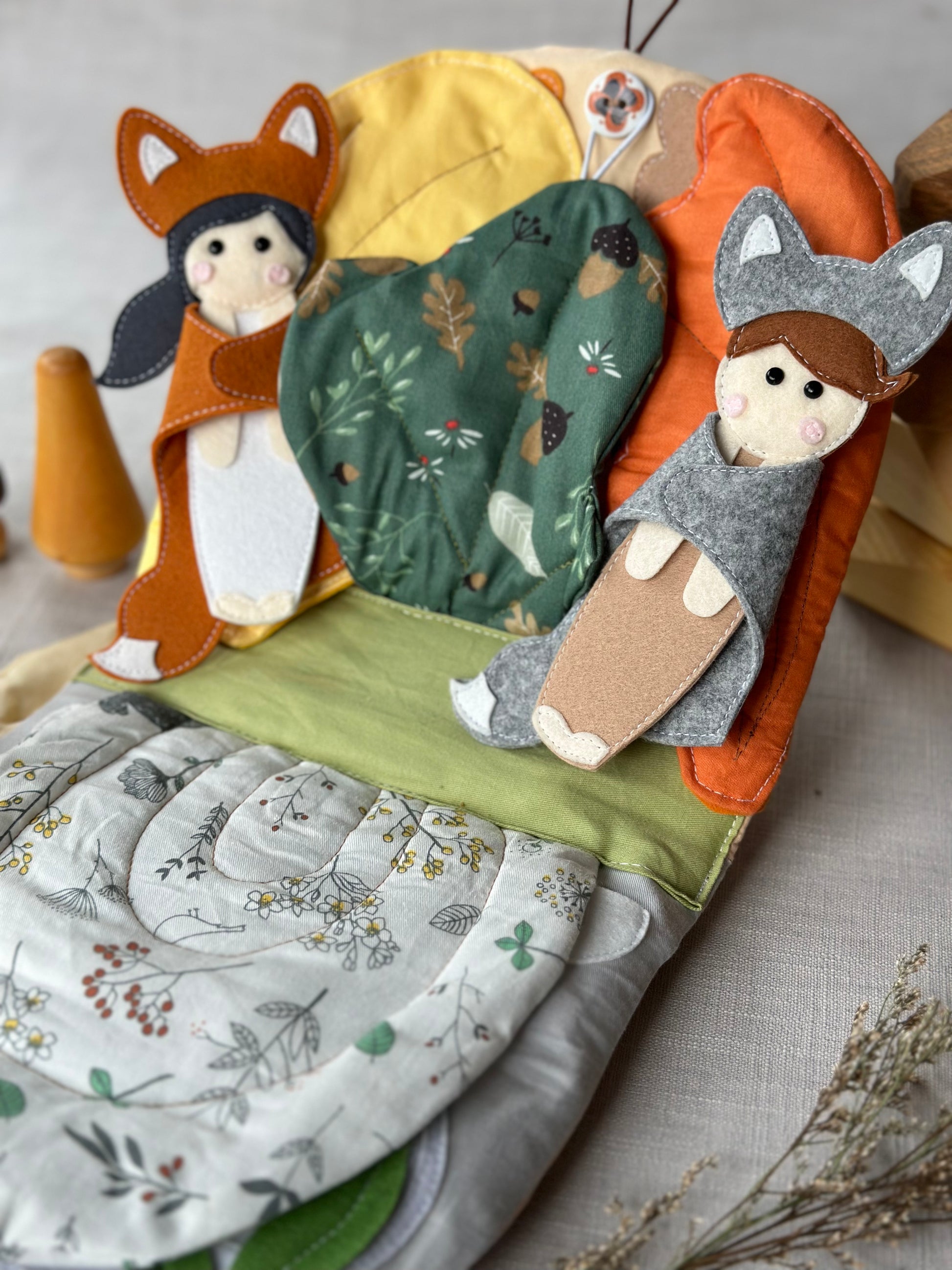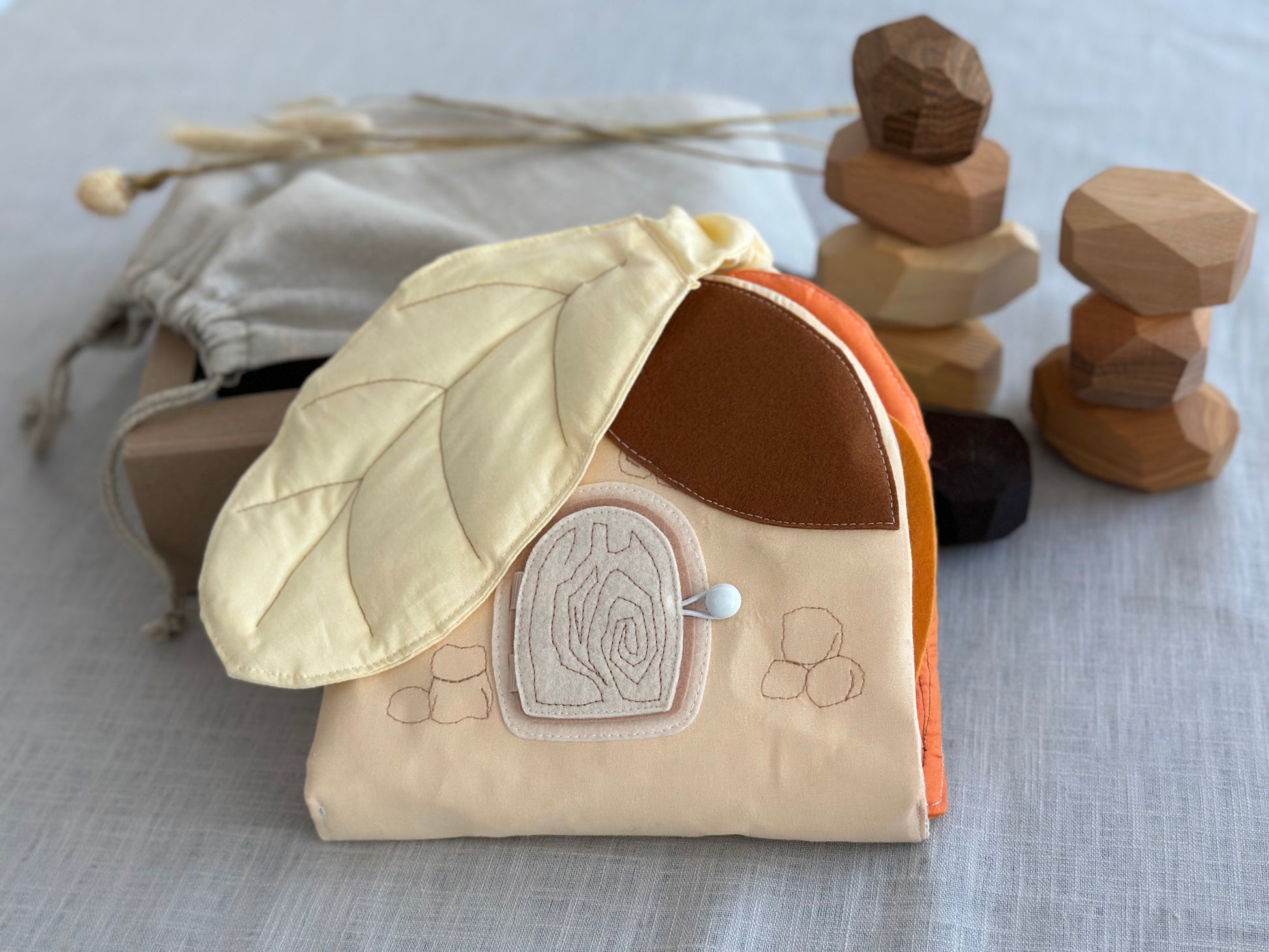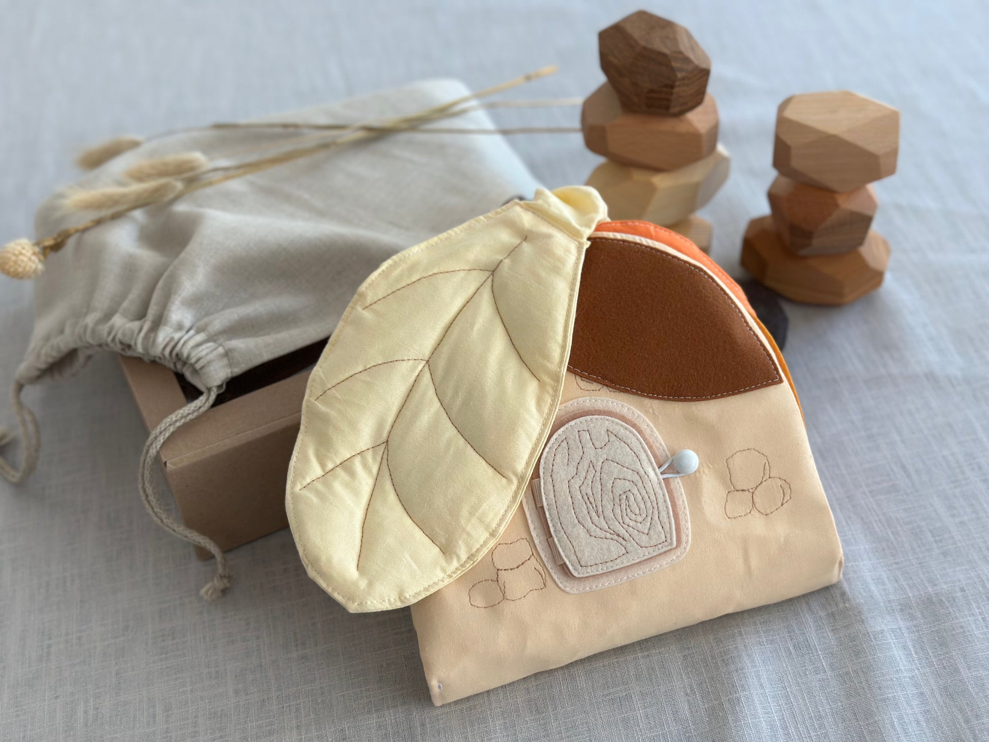 Das Buch erscheint als eine coole, stylische Handtasche. Weich und biegsam ist das Häuschen aus reiner Baumwolle und Filz, liebevoll per Hand gefertigt. Die Seiten knistern und sorgen für ein taktiles Spielerlebnis.