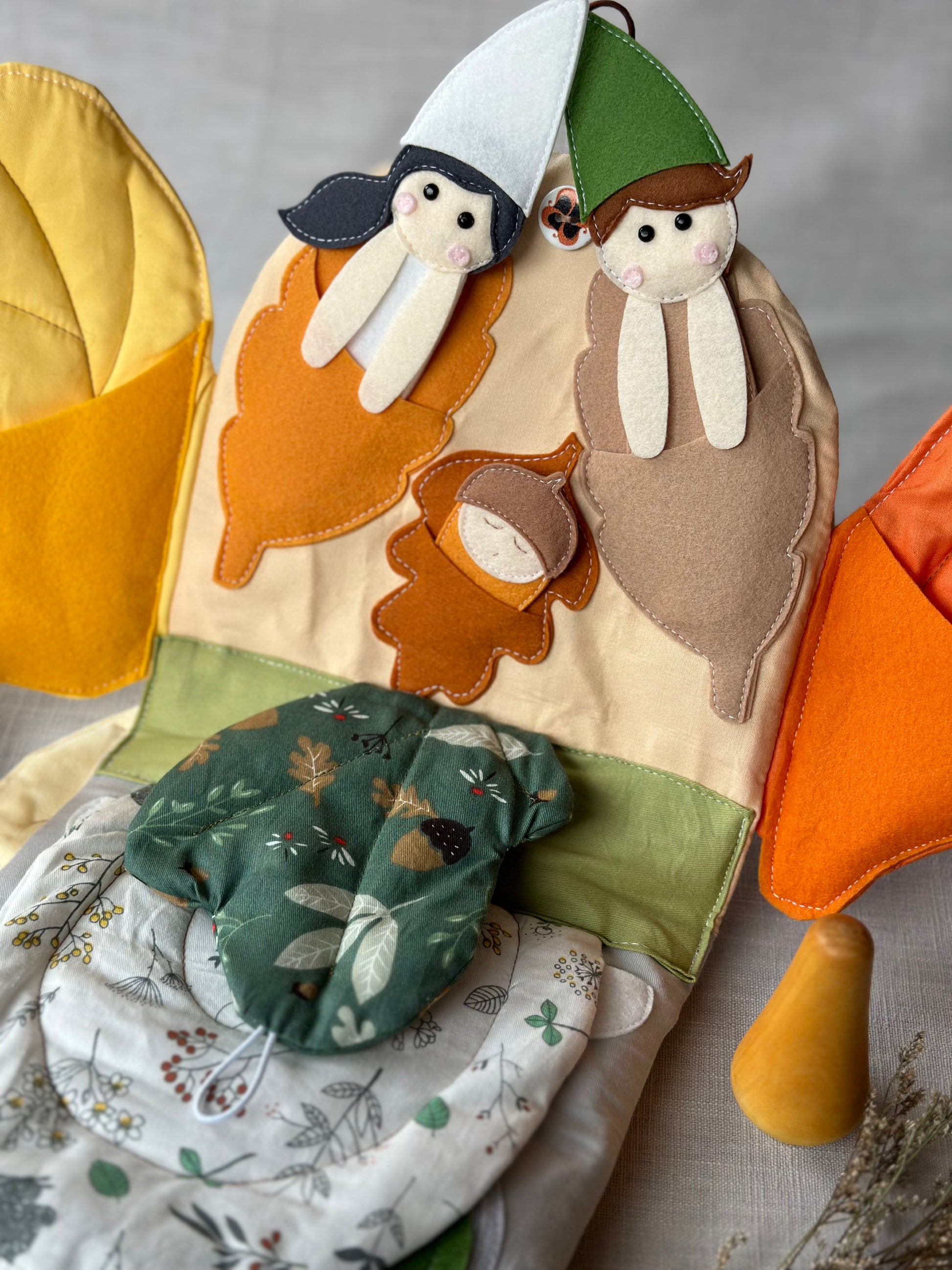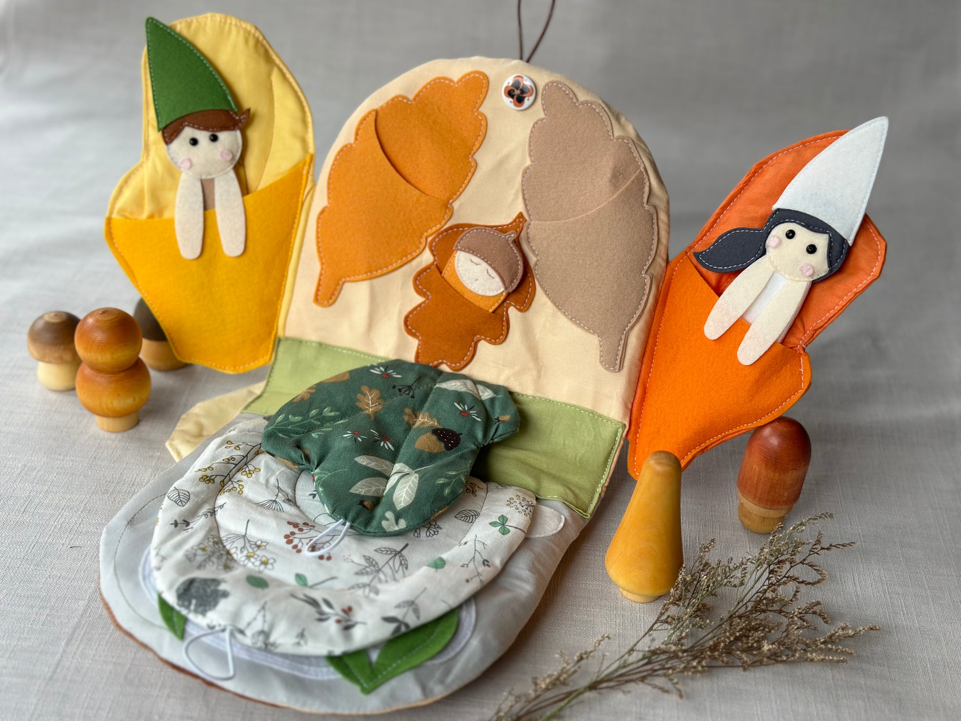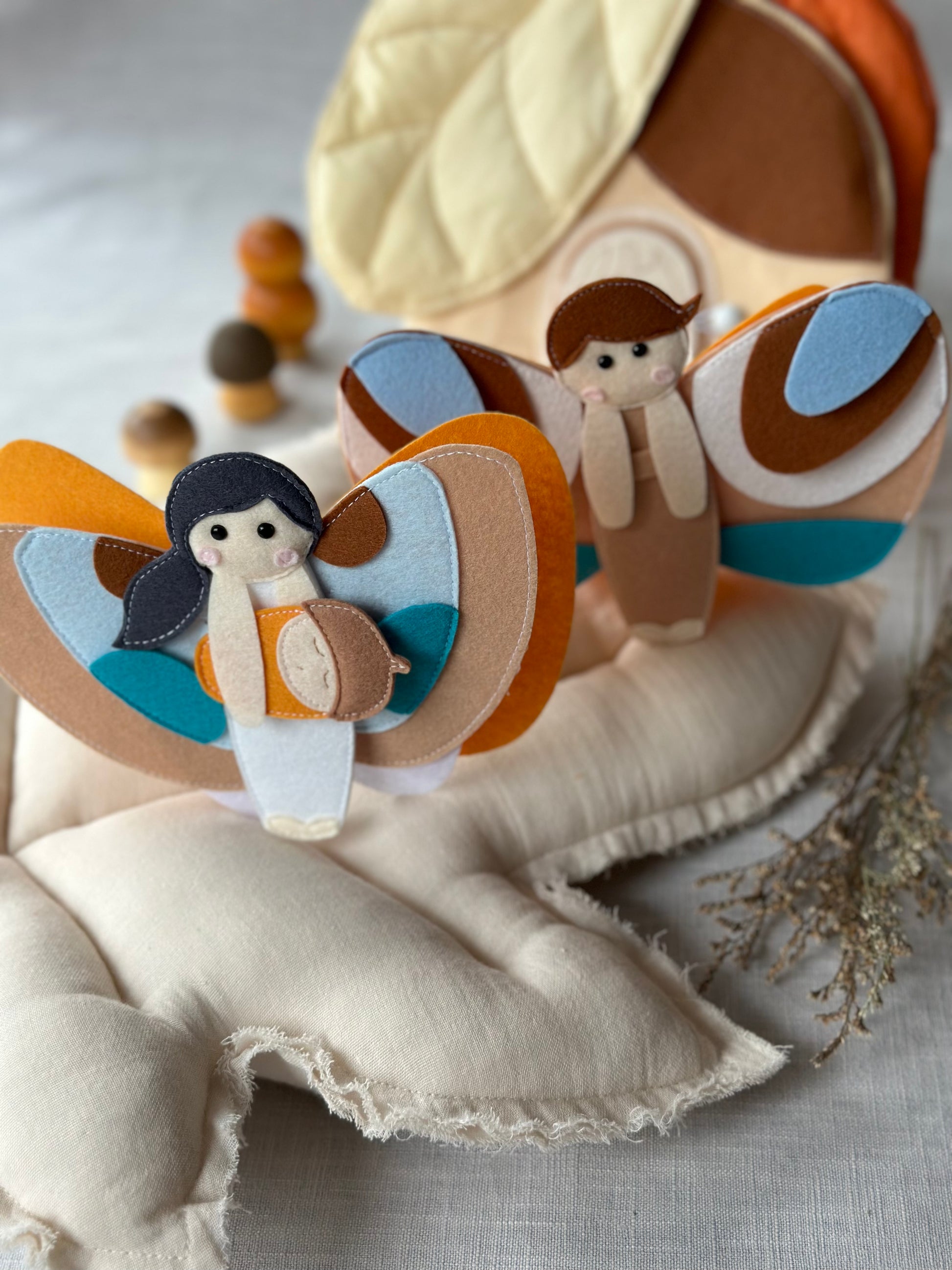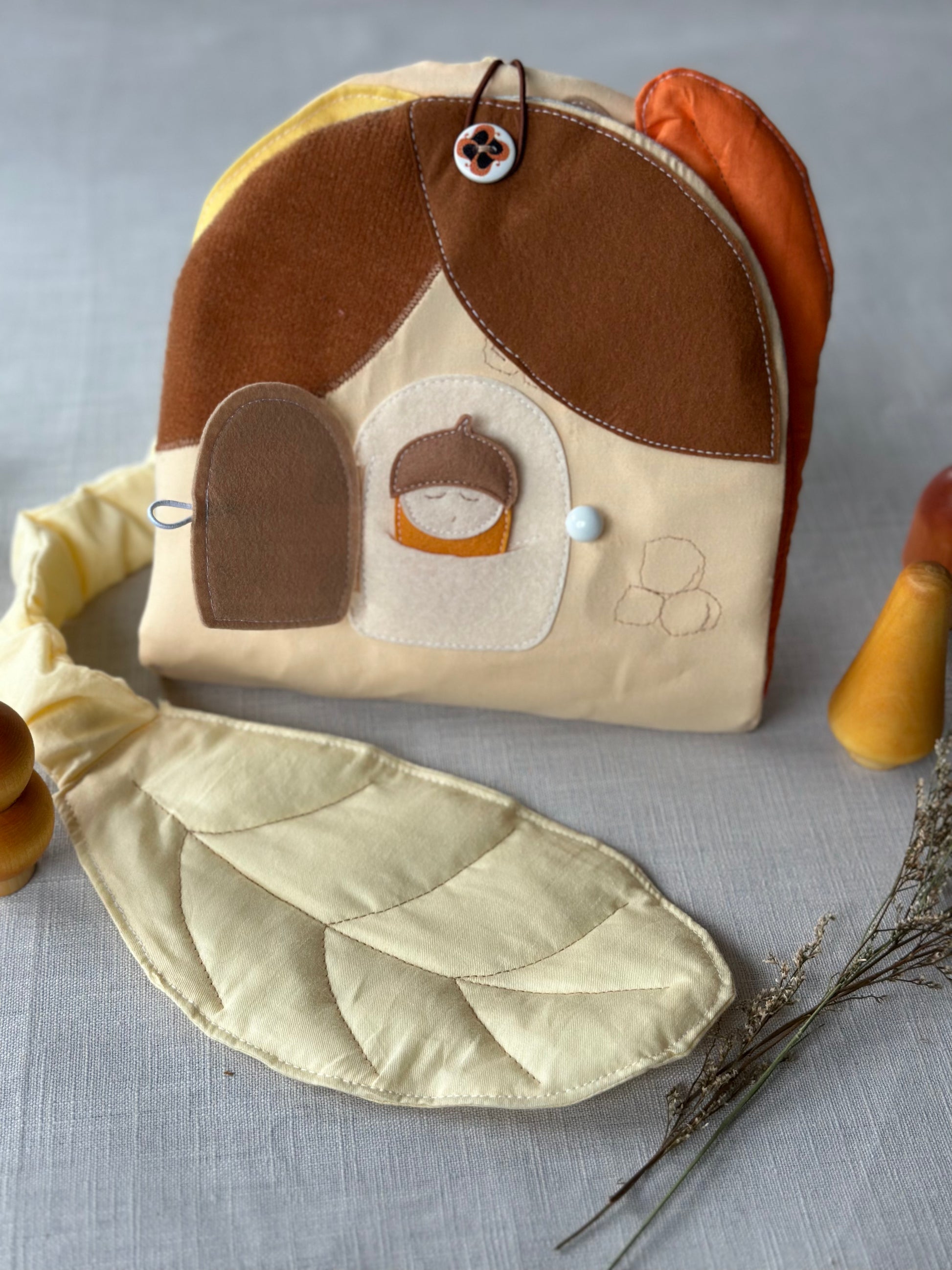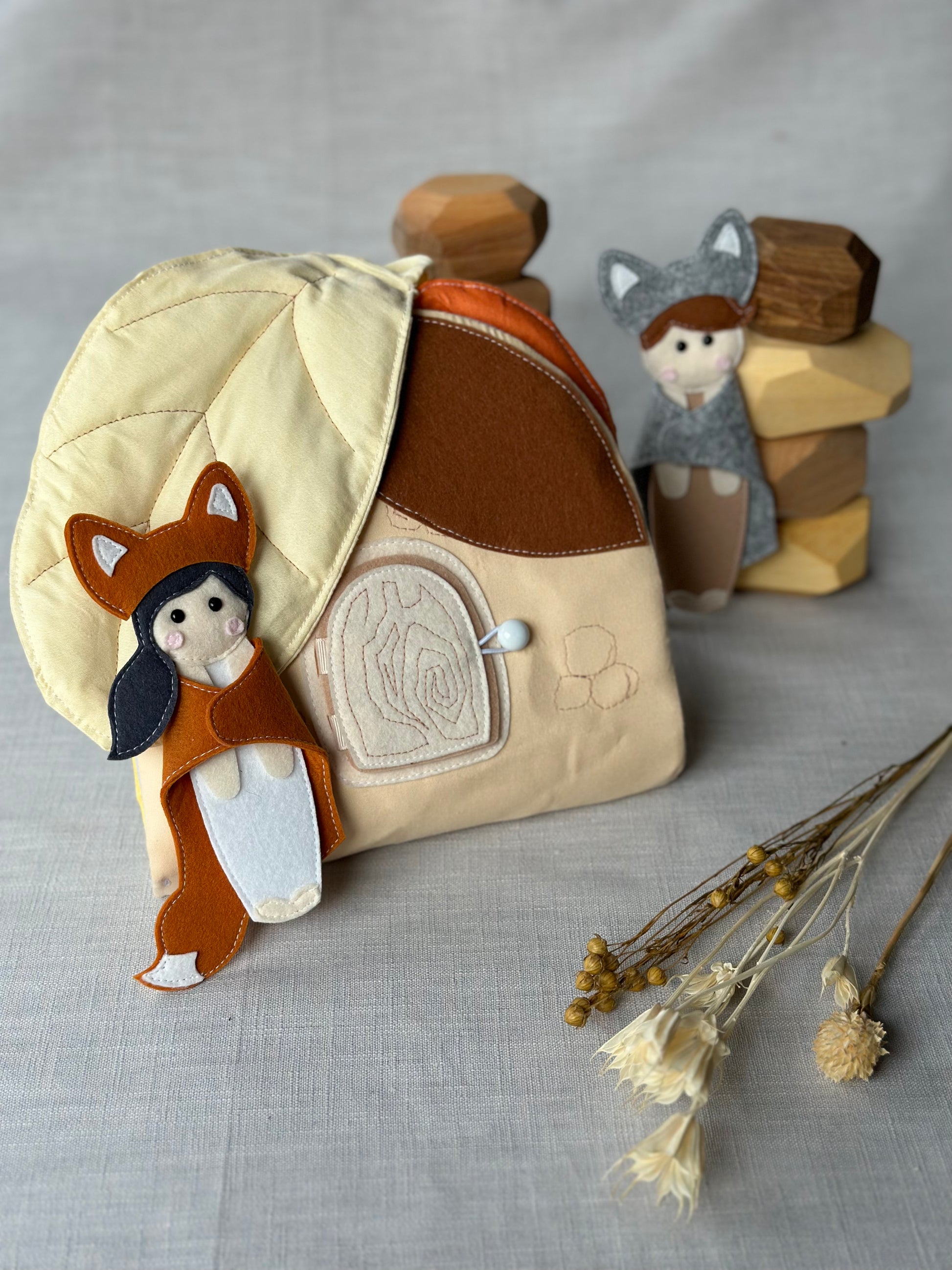 Das Häuschen im Wald bewohnt eine kleine Elfenfamilie. Die Elfen schlafen gemütlich in ihren Betten und decken sich mit den weichen Blättern zu. Am frühen Morgen genießen die Elfen den Sonnenaufgang und kuscheln gern auf ihrer Decke. Danach gibt es leckeres Frühstück mit süßen Waldfrüchten. Gestärkt und glücklich starten die Elfen in den neuen Tag.