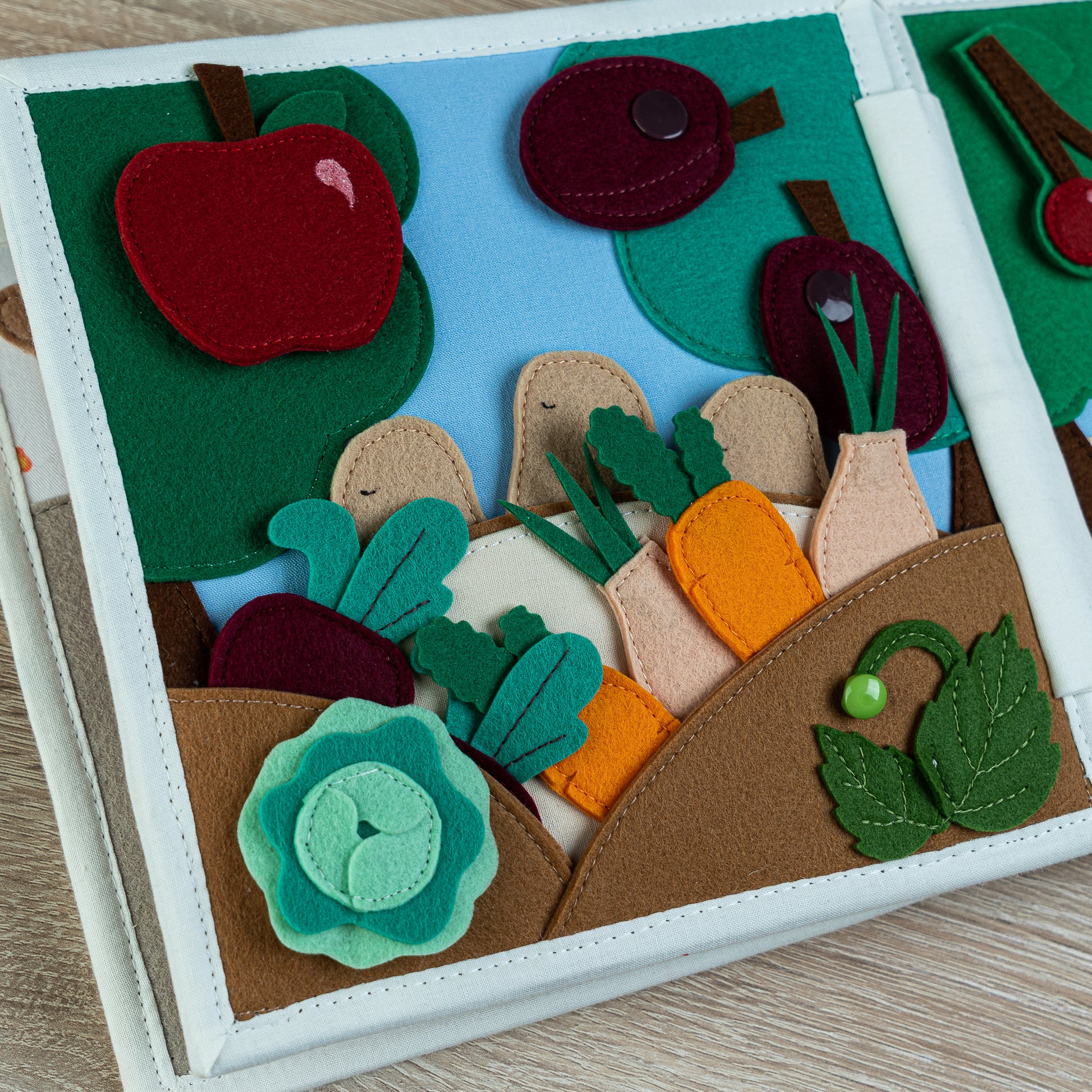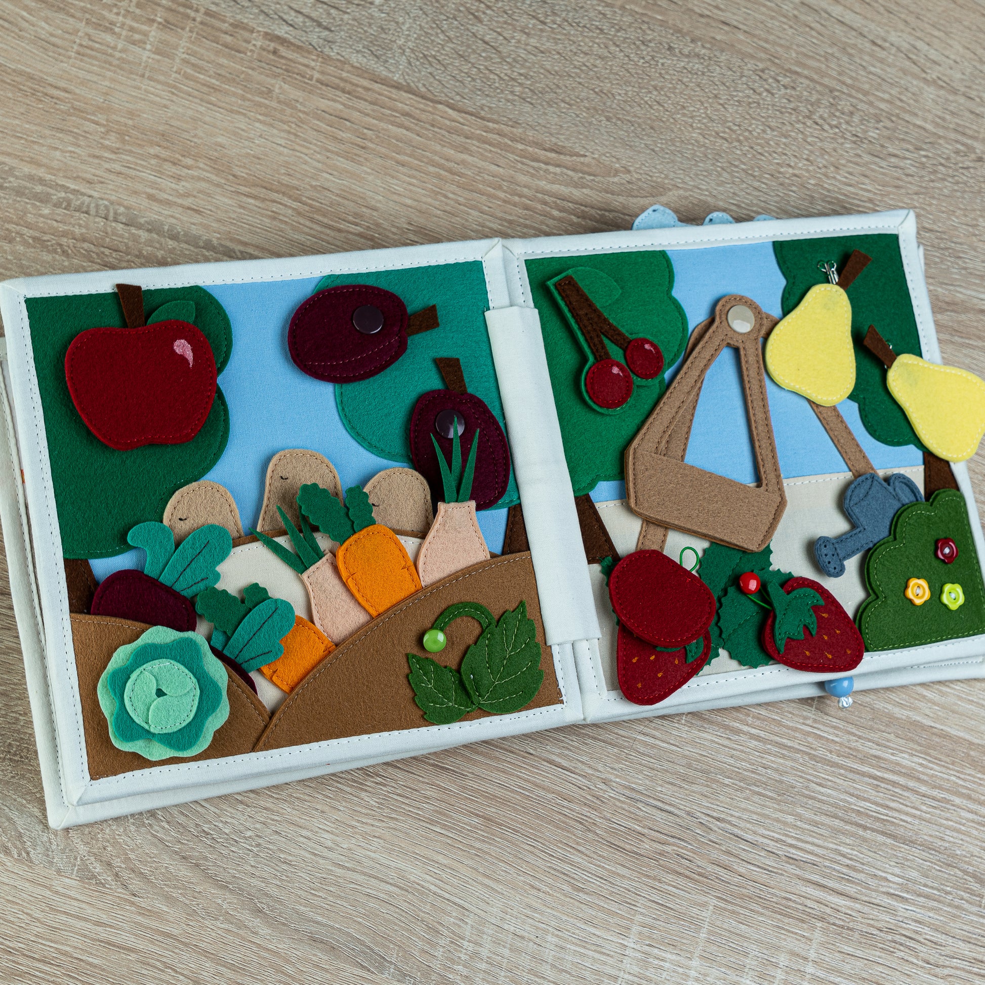 Auf dieser Seite können die Kinder das Gemüse und Obst ernten und beim Öffnen der einzelnen Verschlüsse ihre Feinmotorik schulen.