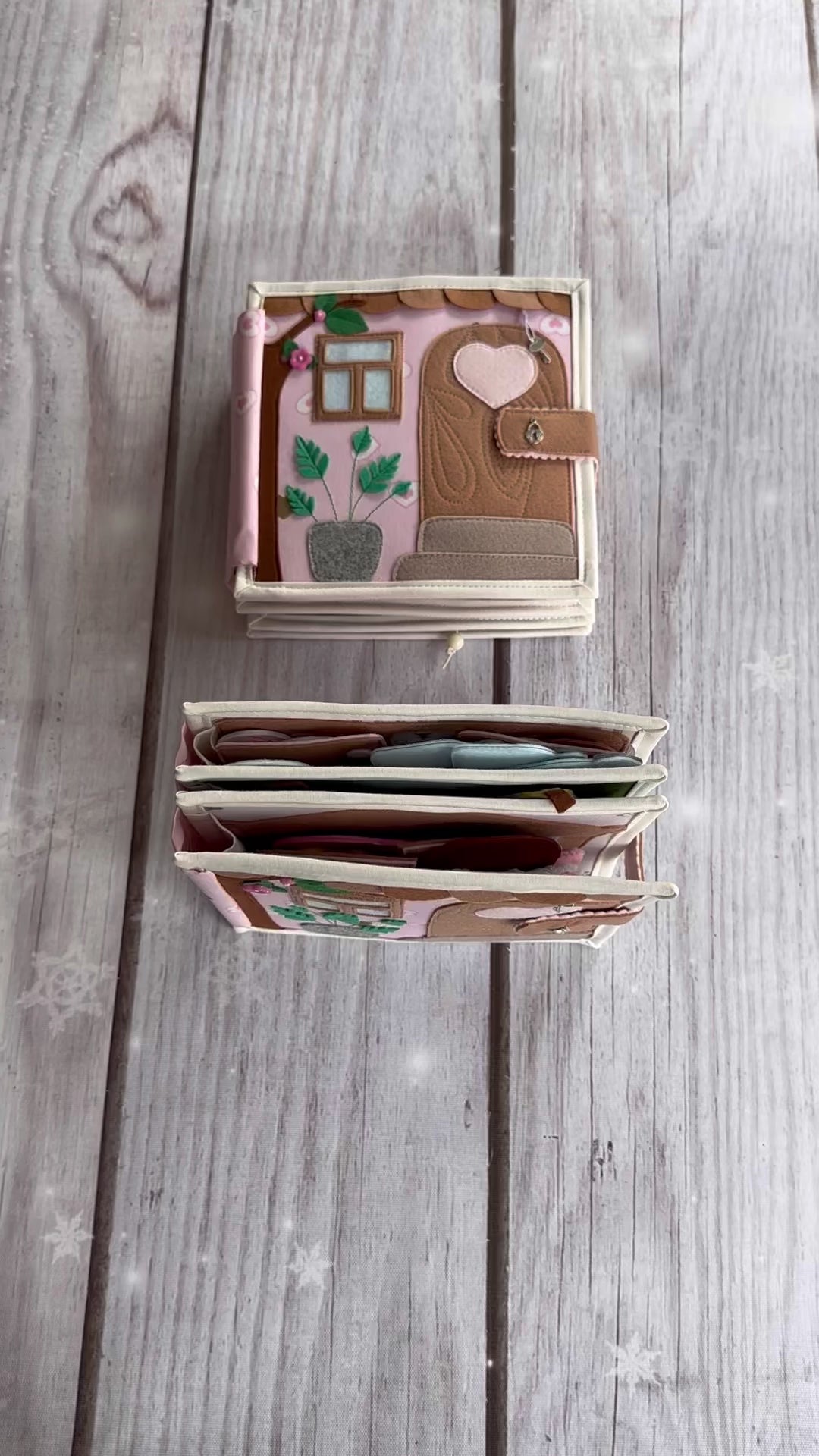 Das schöne, stylische Puppenhaus erscheint in stilvollen, aufeinander abgestimmten Pastelltönen, 20x20 cm groß, 7 Spielseiten, aus reiner Baumwolle und Filz liebevoll per Hand gefertigt.