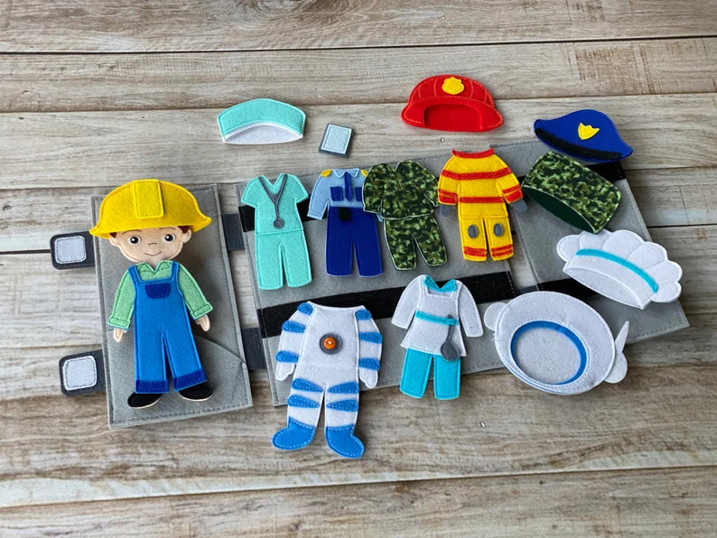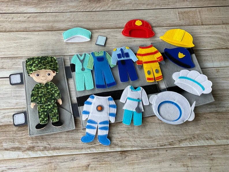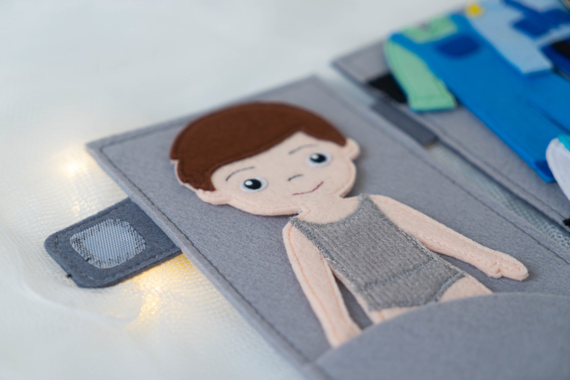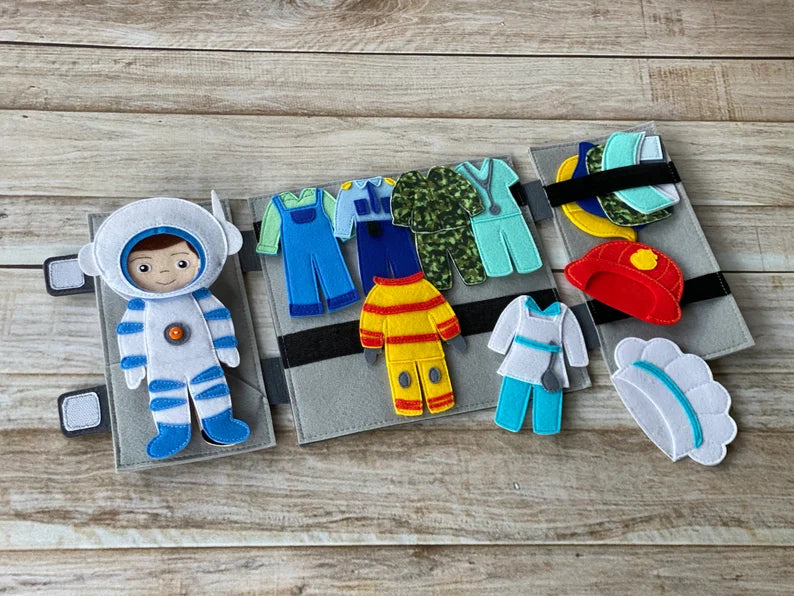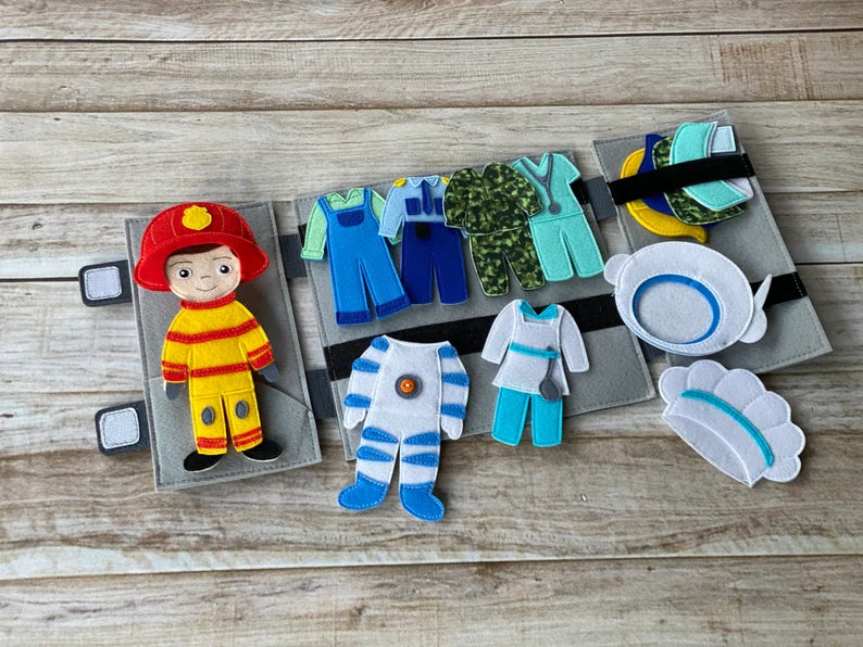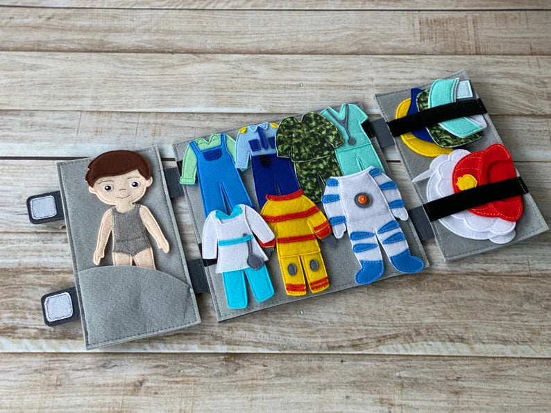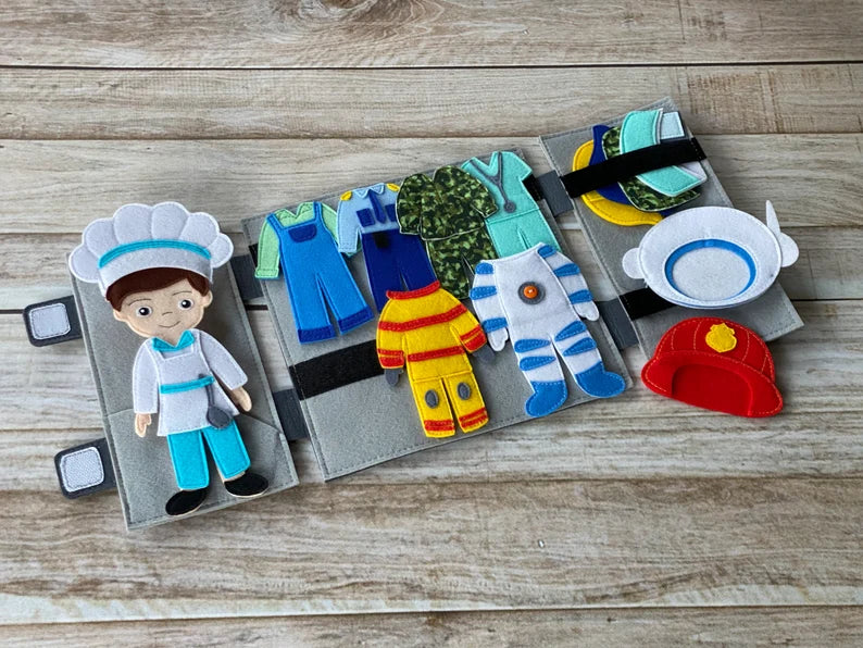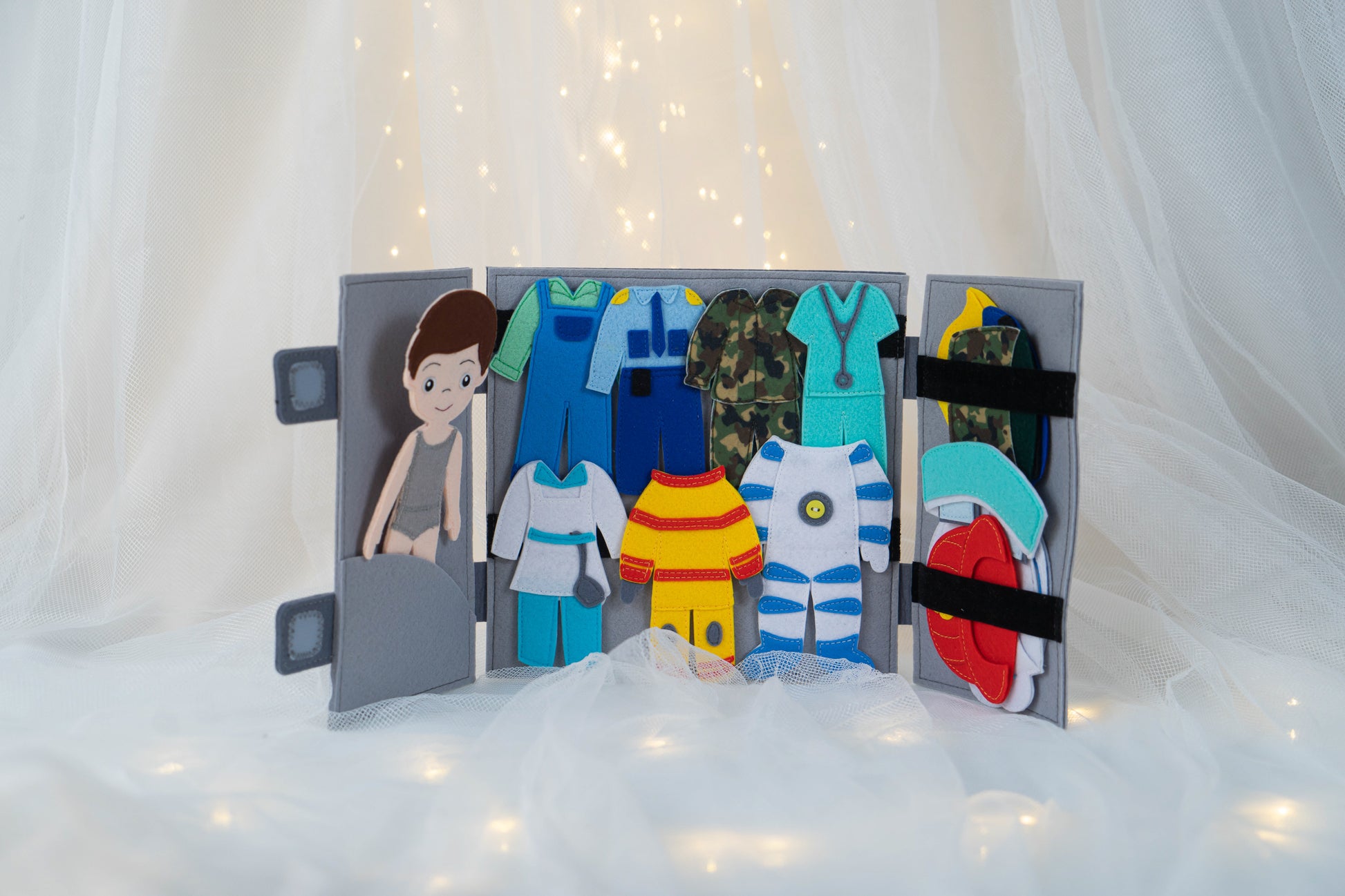 Das Büchlein aus Filz erscheint als eine dezente Ankleide in einem coolen Grauton. In der Ankleide wartet auf uns ein Junge namens Jens. Er ist total aufgeregt und kann es kaum erwarten, in den spannenden Berufen zu schnuppern und die coolen Uniformen anzuprobieren.