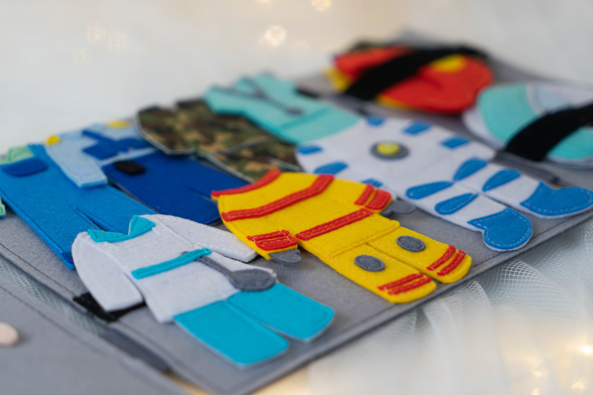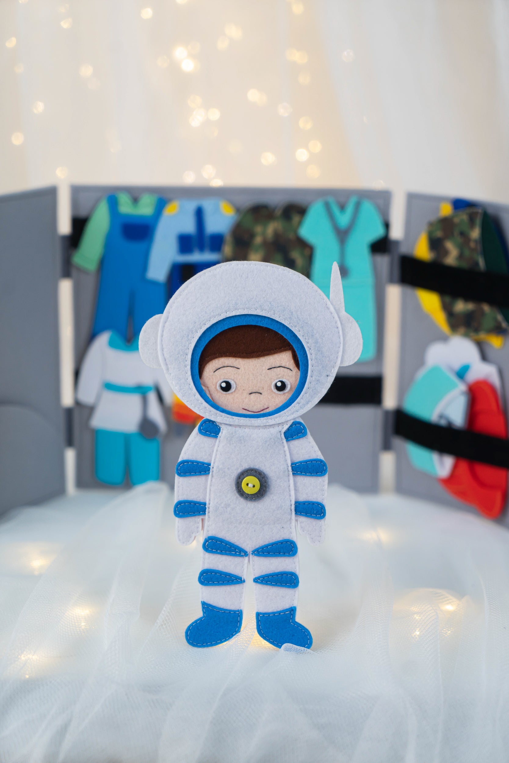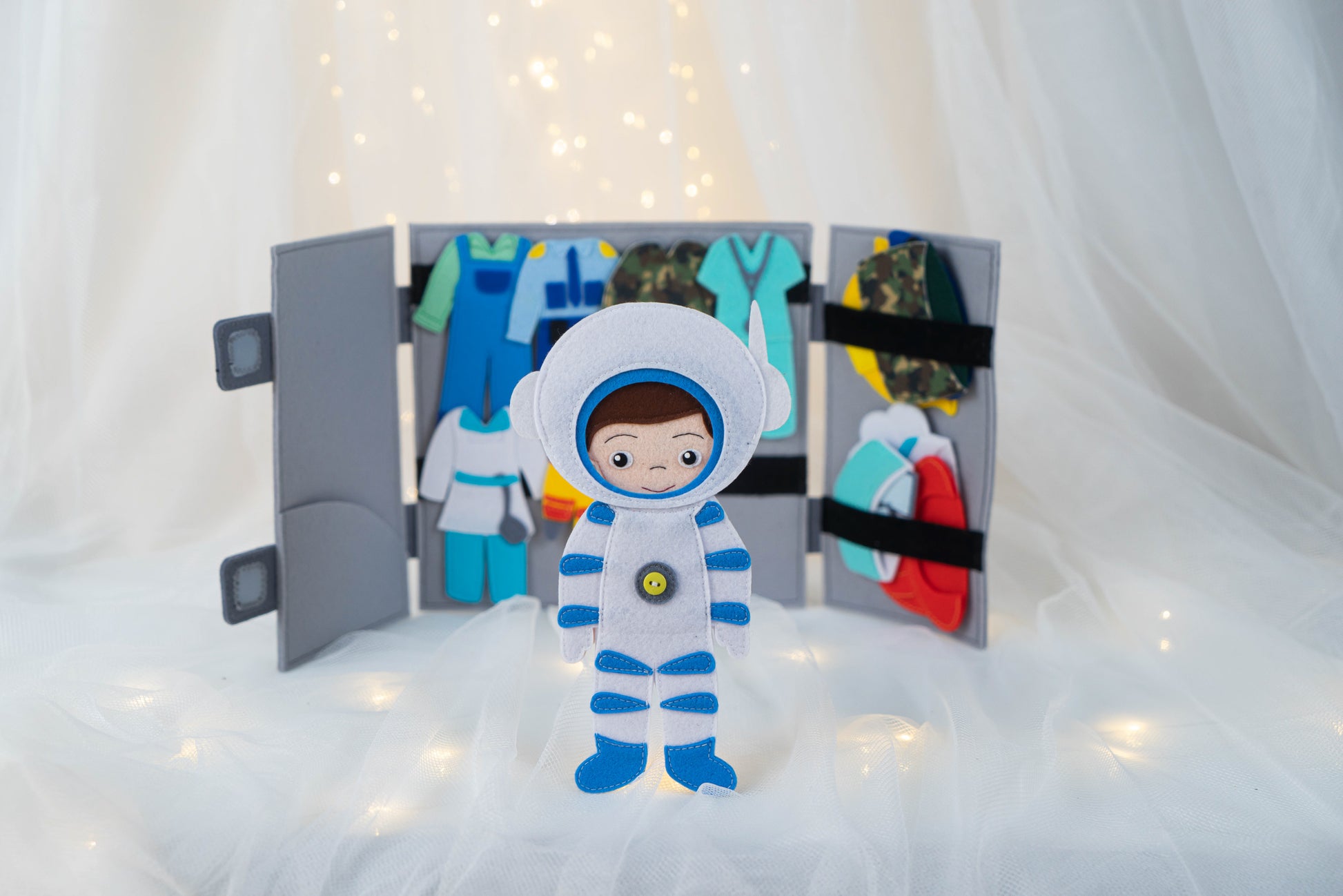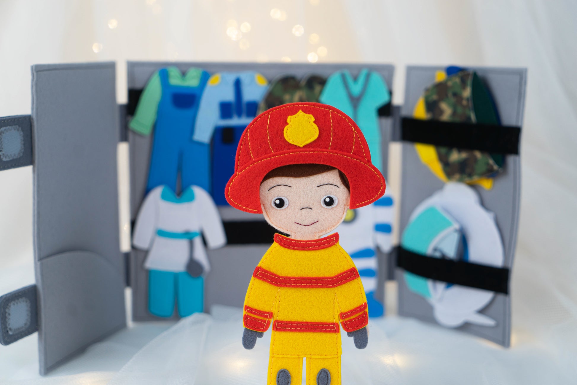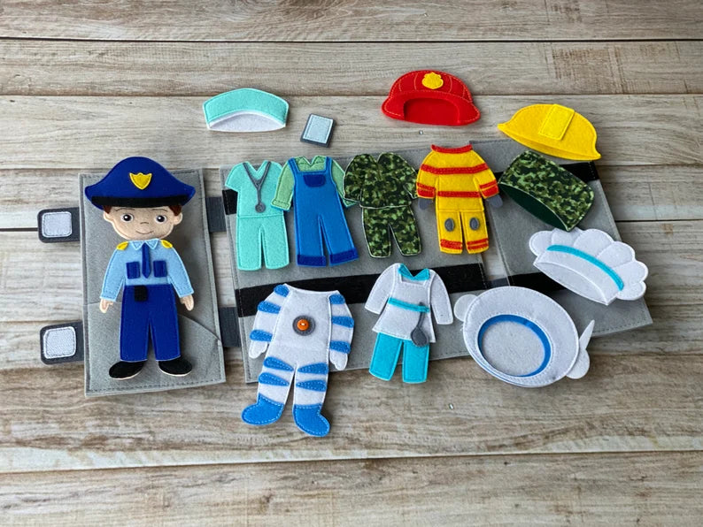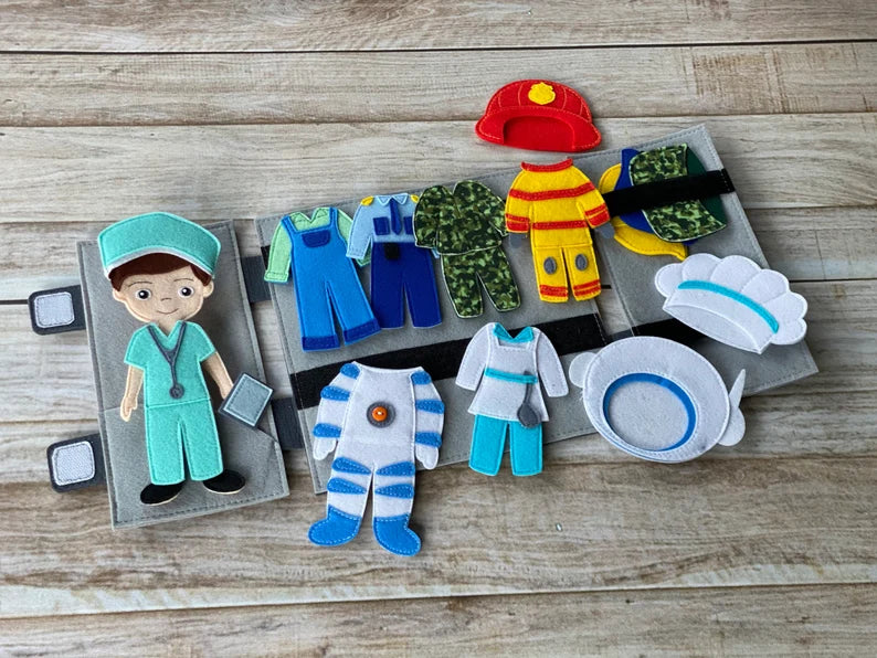 Das Büchlein aus Filz erscheint als eine dezente Ankleide in einem coolen Grauton. In der Ankleide wartet auf uns ein Junge namens Jens. Er ist total aufgeregt und kann es kaum erwarten, in den spannenden Berufen zu schnuppern und die coolen Uniformen anzuprobieren.