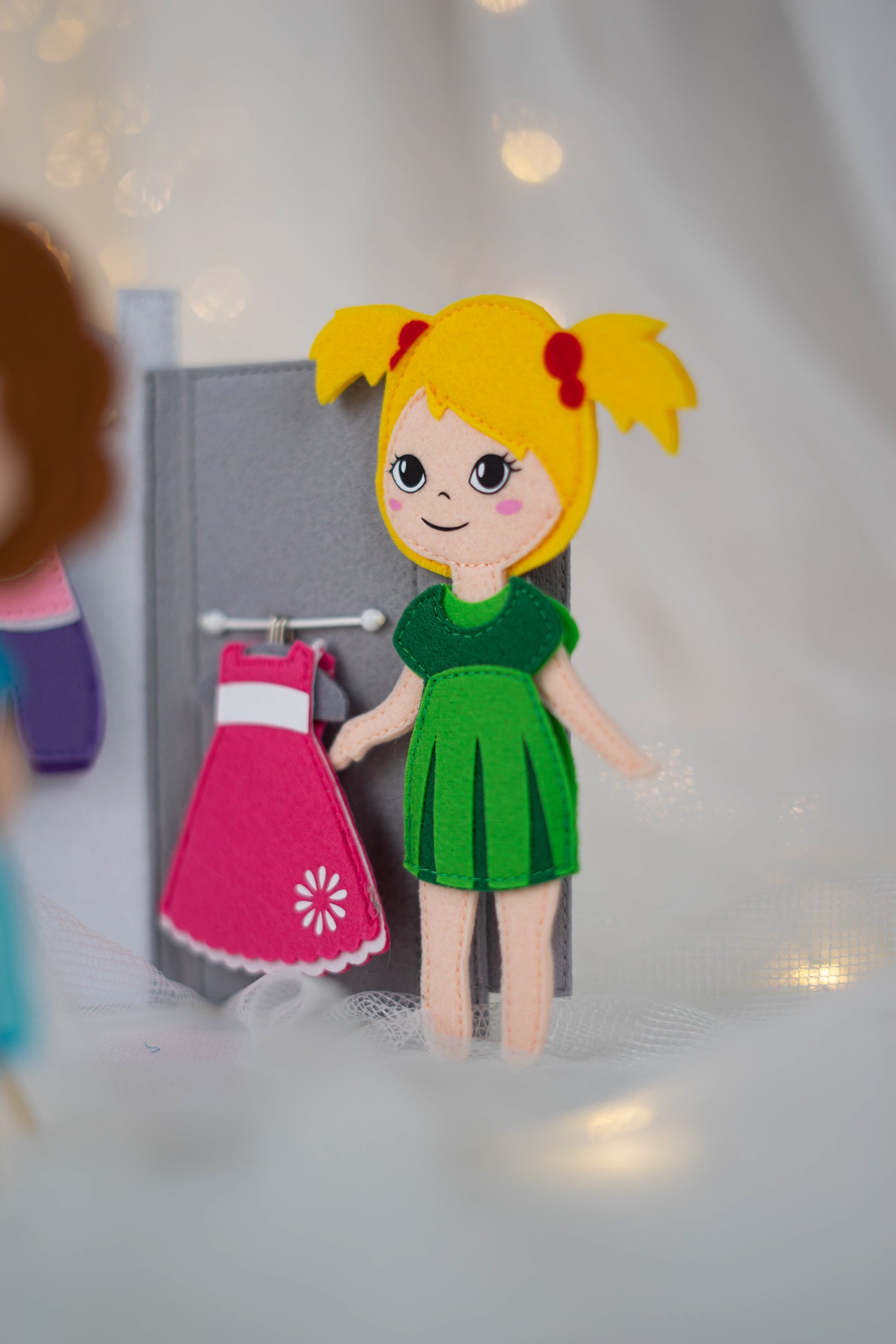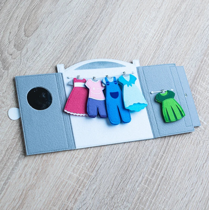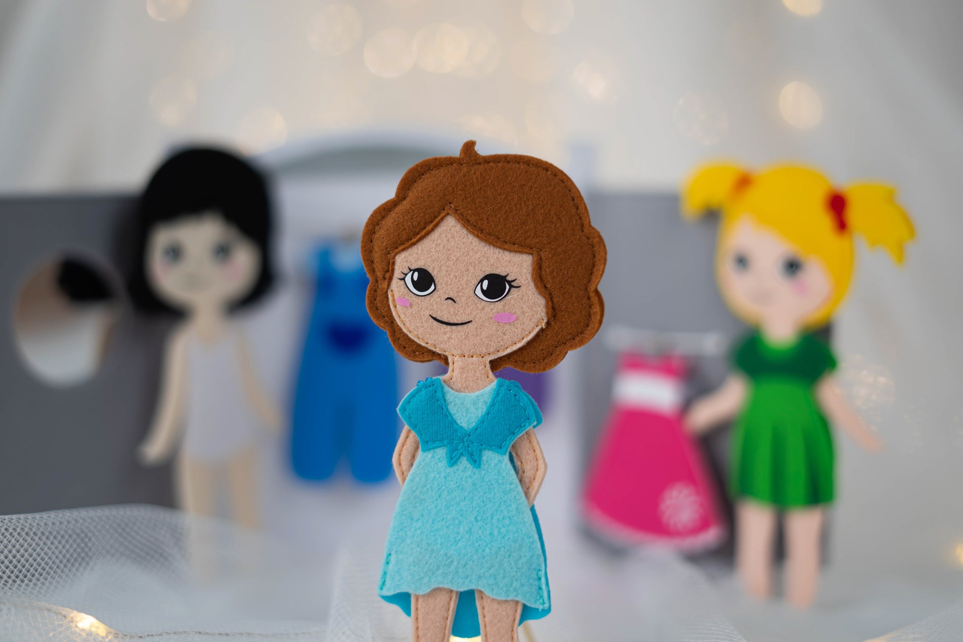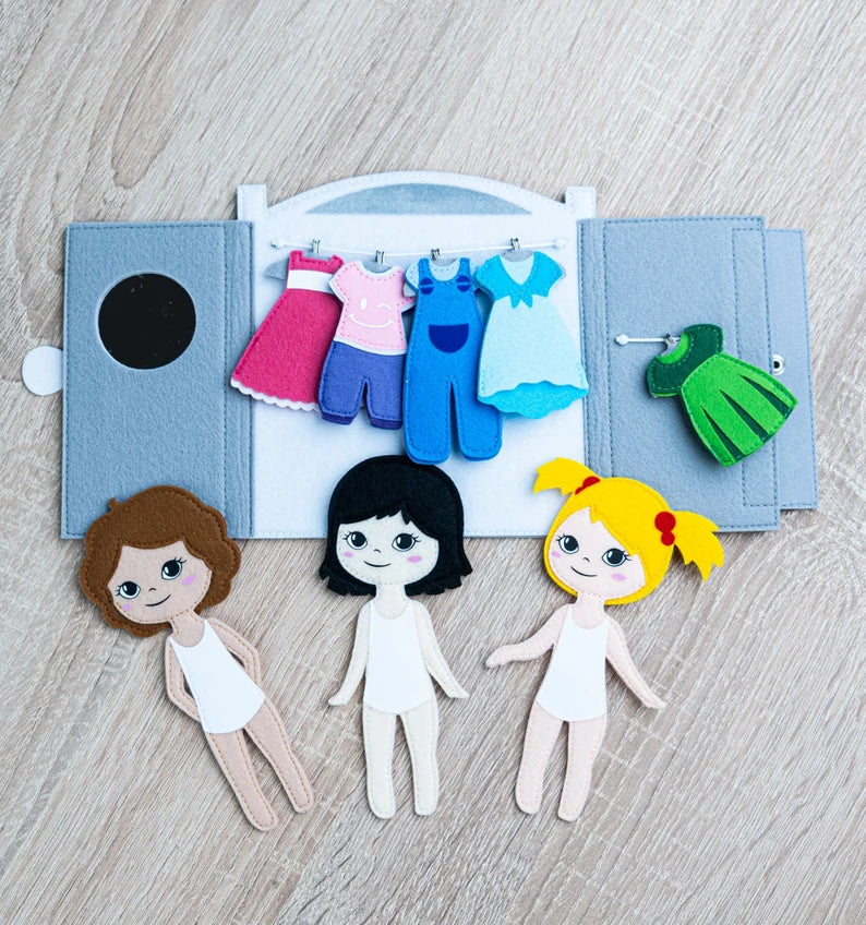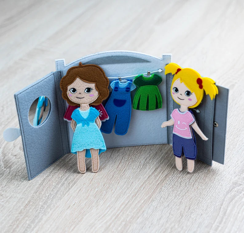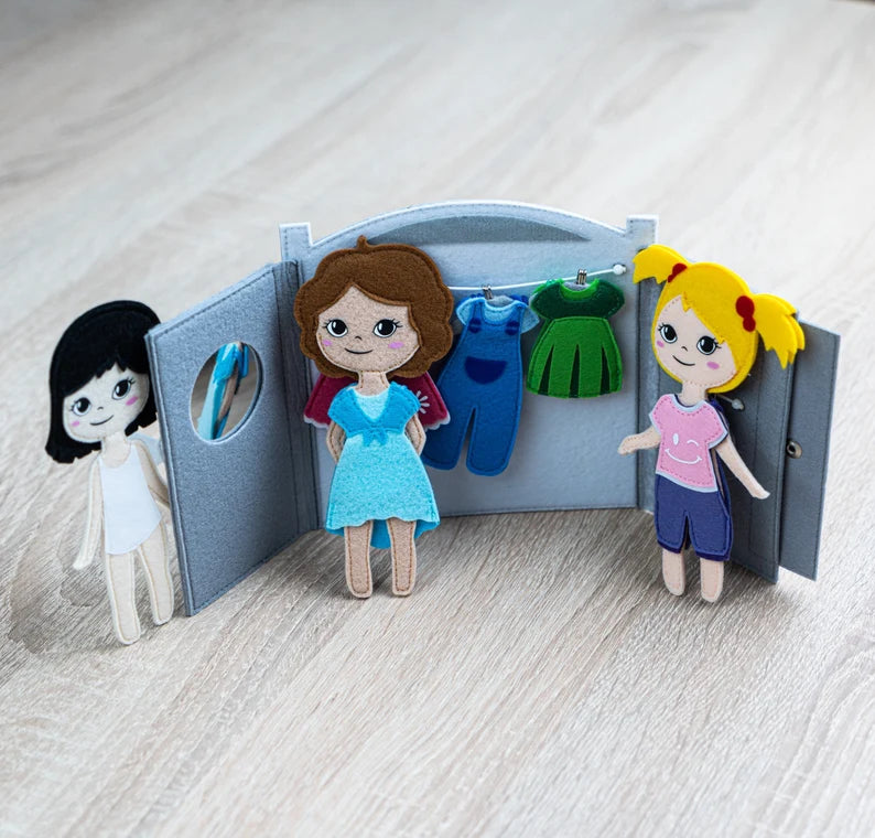 Die schicken Klamotten werden auf die Puppen angezogen und nicht mit Klettverschluss befestigt. Das ist nicht so einfach, wie es aussieht und erfordert Konzentration und Geschicklichkeit des Kindes.