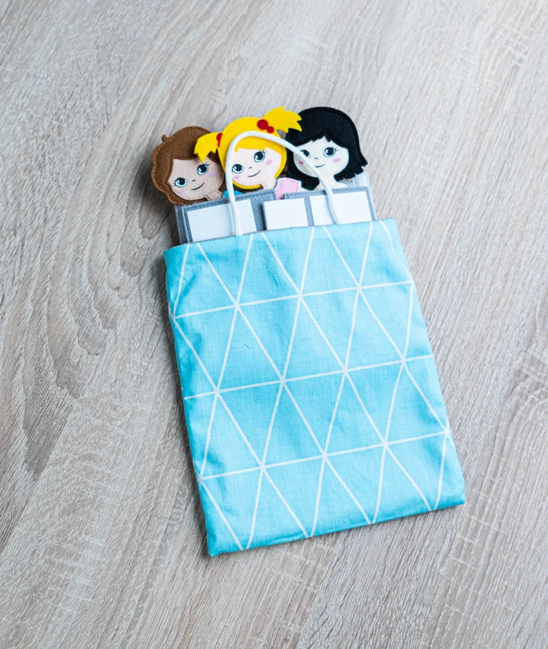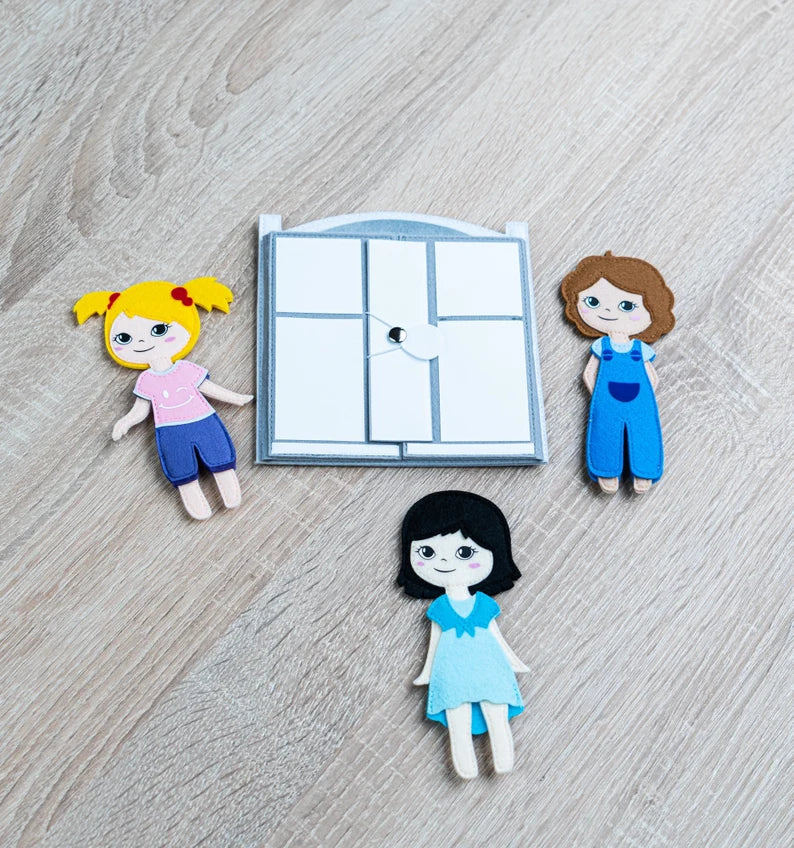 Das Büchlein aus Filz erscheint als eine dezente Ankleide in einem hellen Grauton. In der Ankleide warten auf uns drei Mädchen, die sehr gespannt auf ihre neuen Outfits sind.