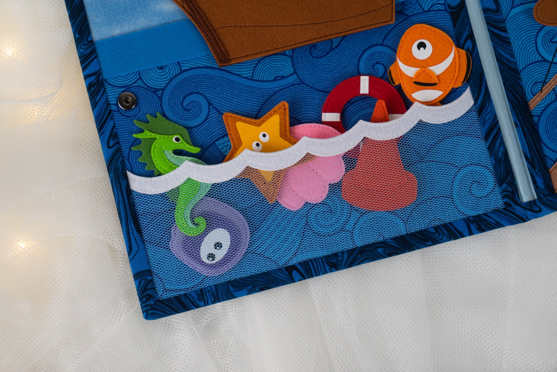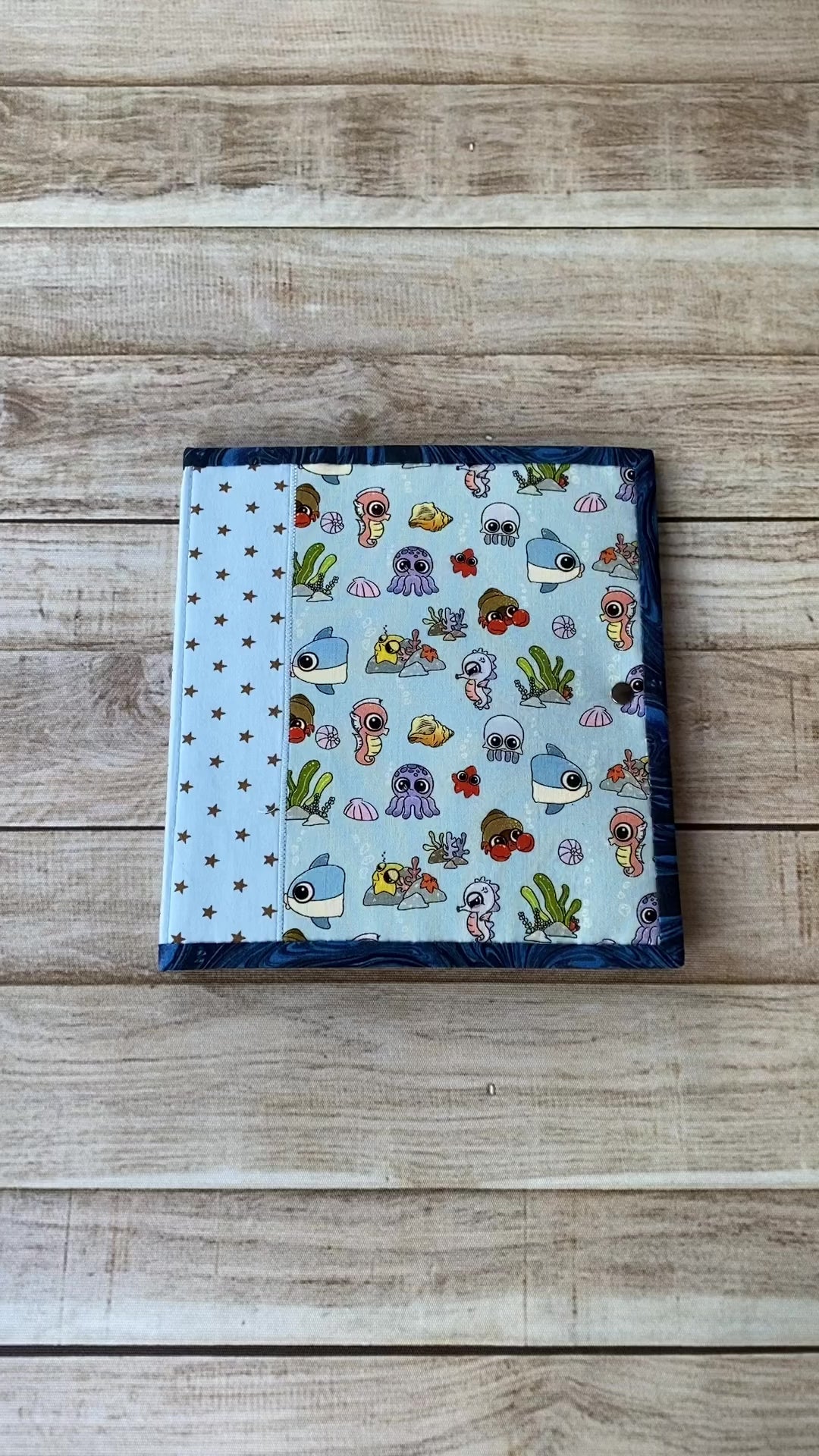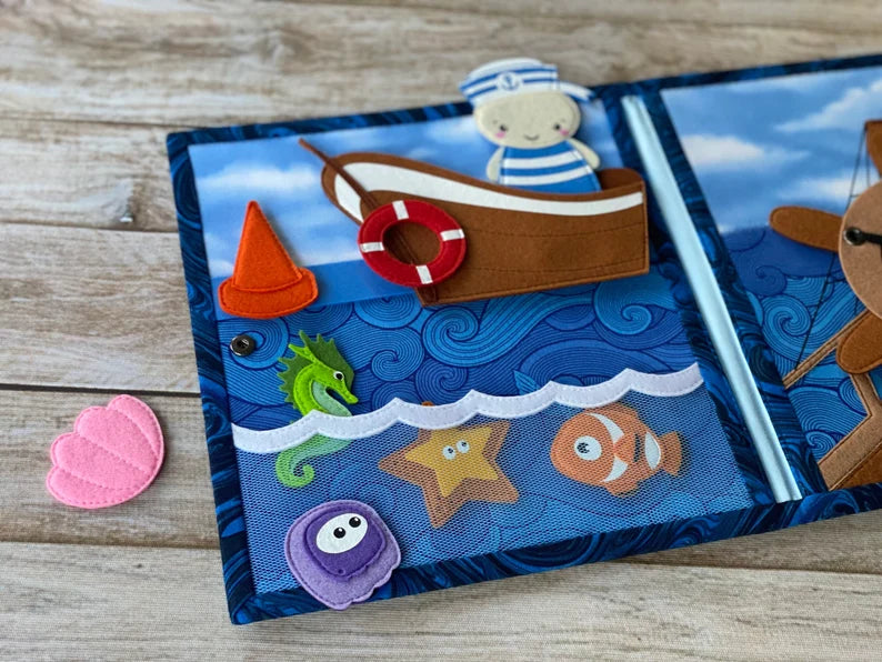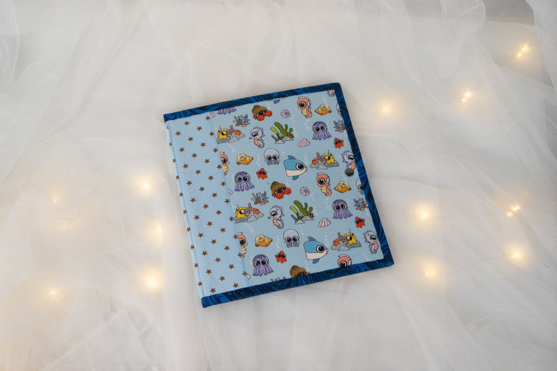 Schönes und farbenfrohes Büchlein aus Baumwolle und Filz in wunderschönen Blautönen.