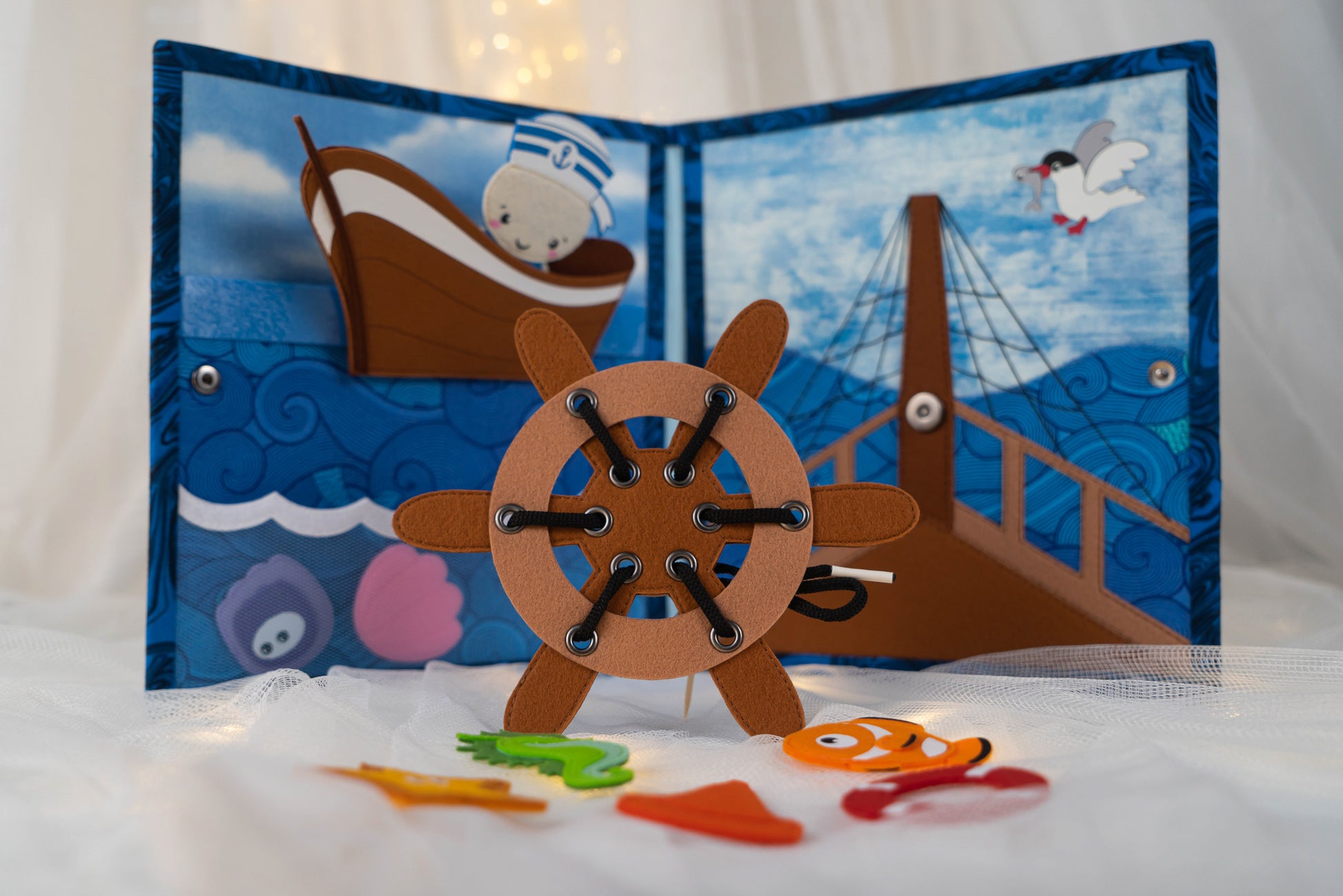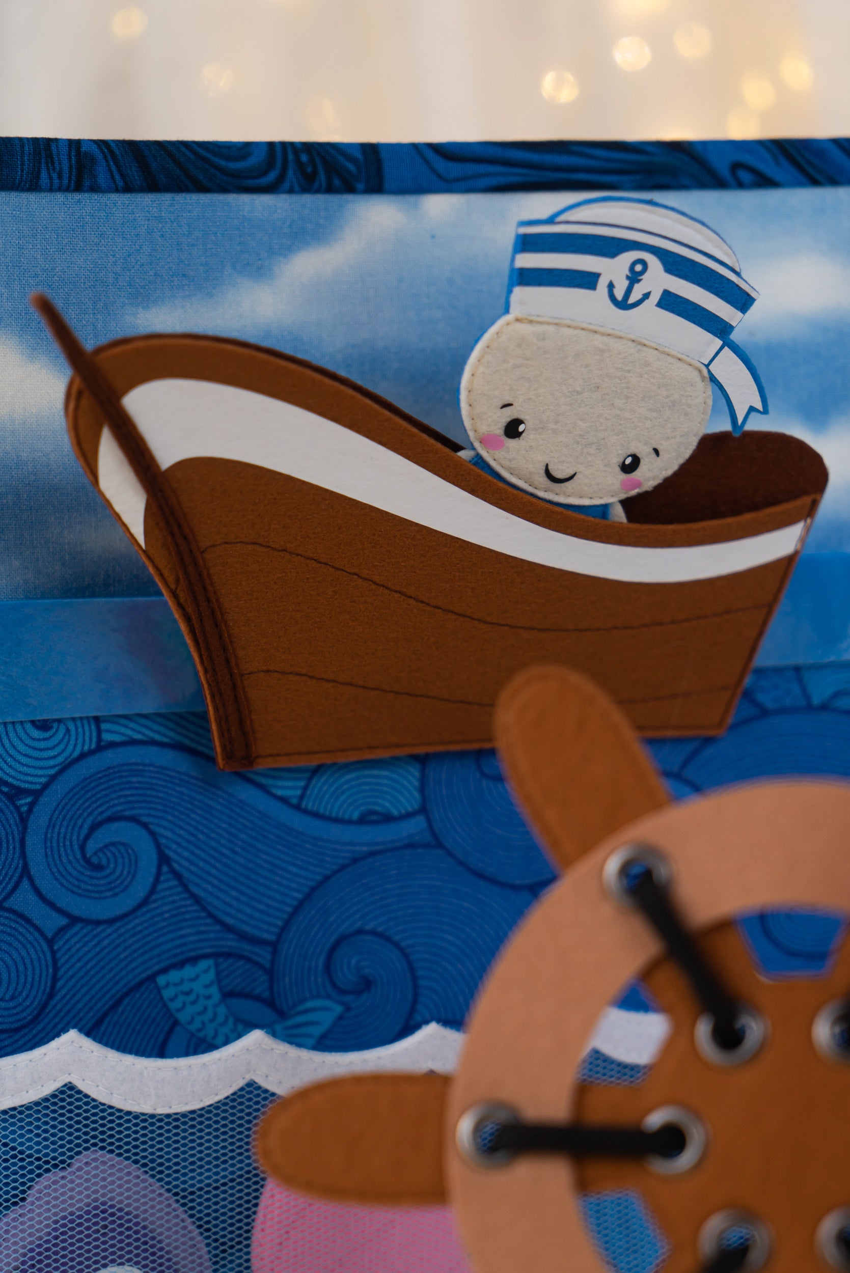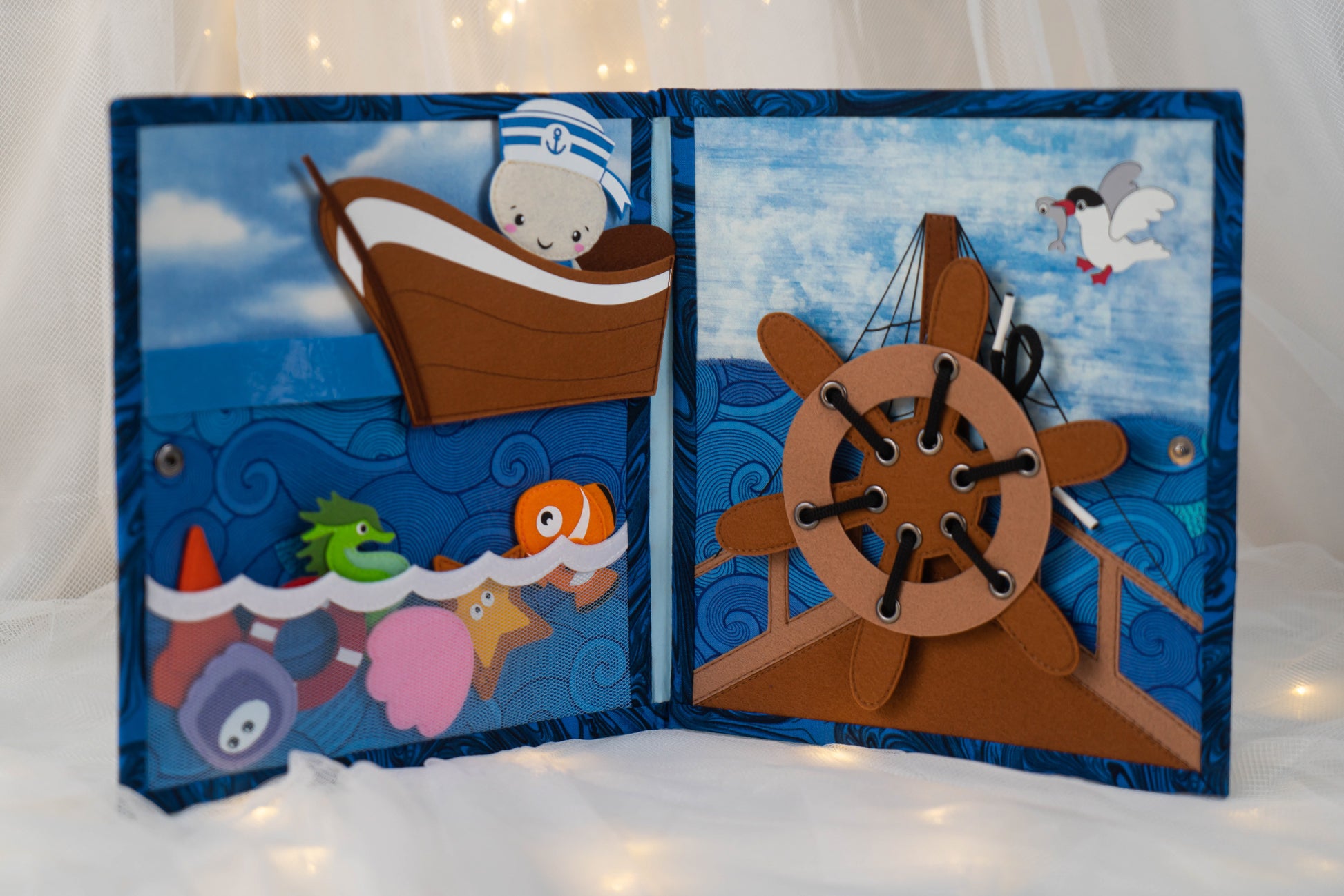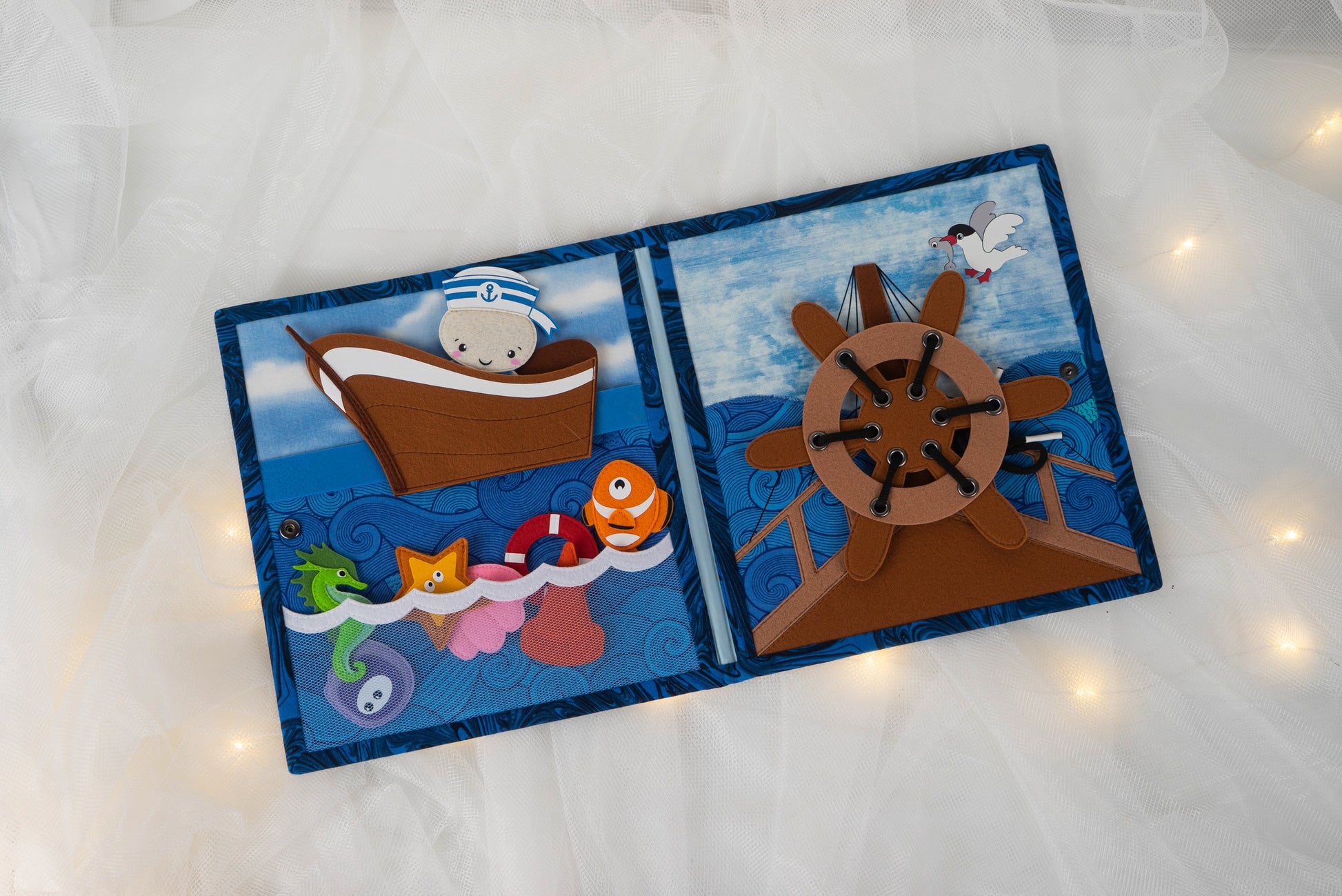 Schönes und farbenfrohes Büchlein aus Baumwolle und Filz in wunderschönen Blautönen.