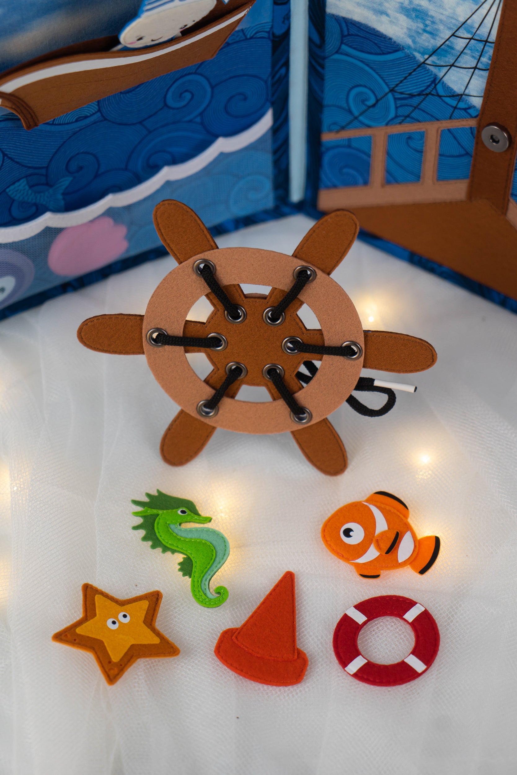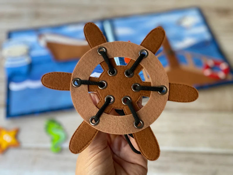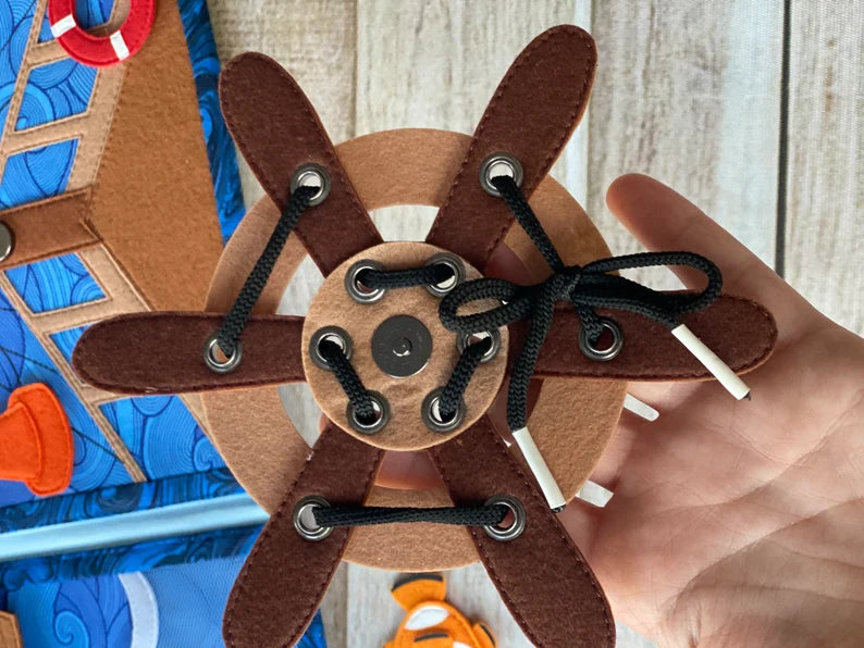 Das Steuerrad-Fädelspiel bietet eine tolle Beschäftigung und trainiert die feinmotorischen Fähigkeiten des Kindes.