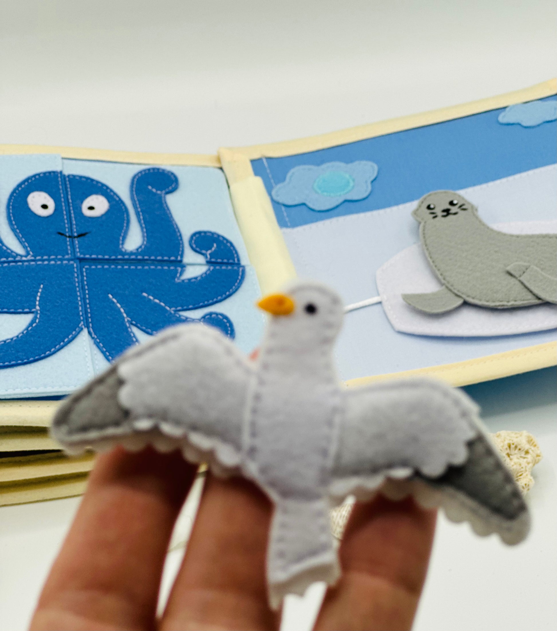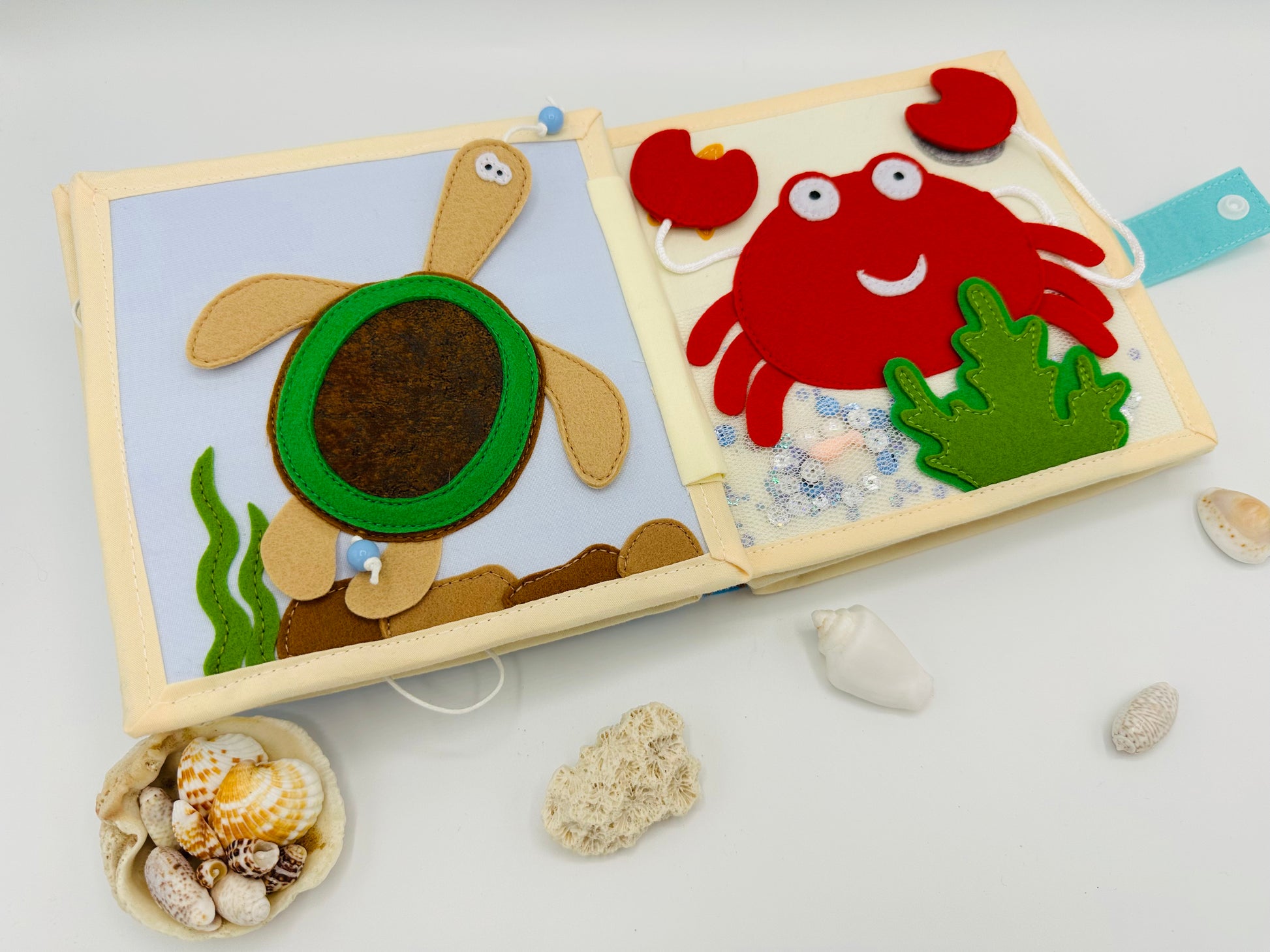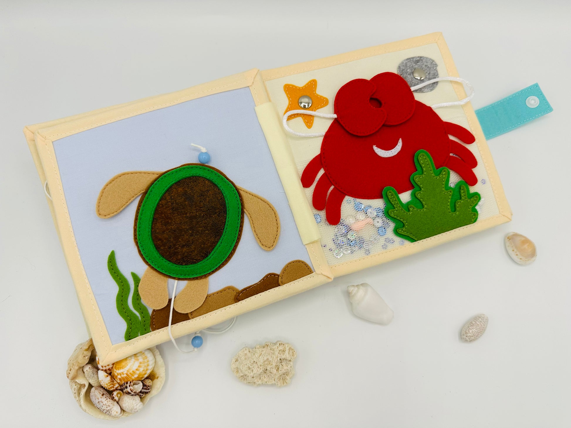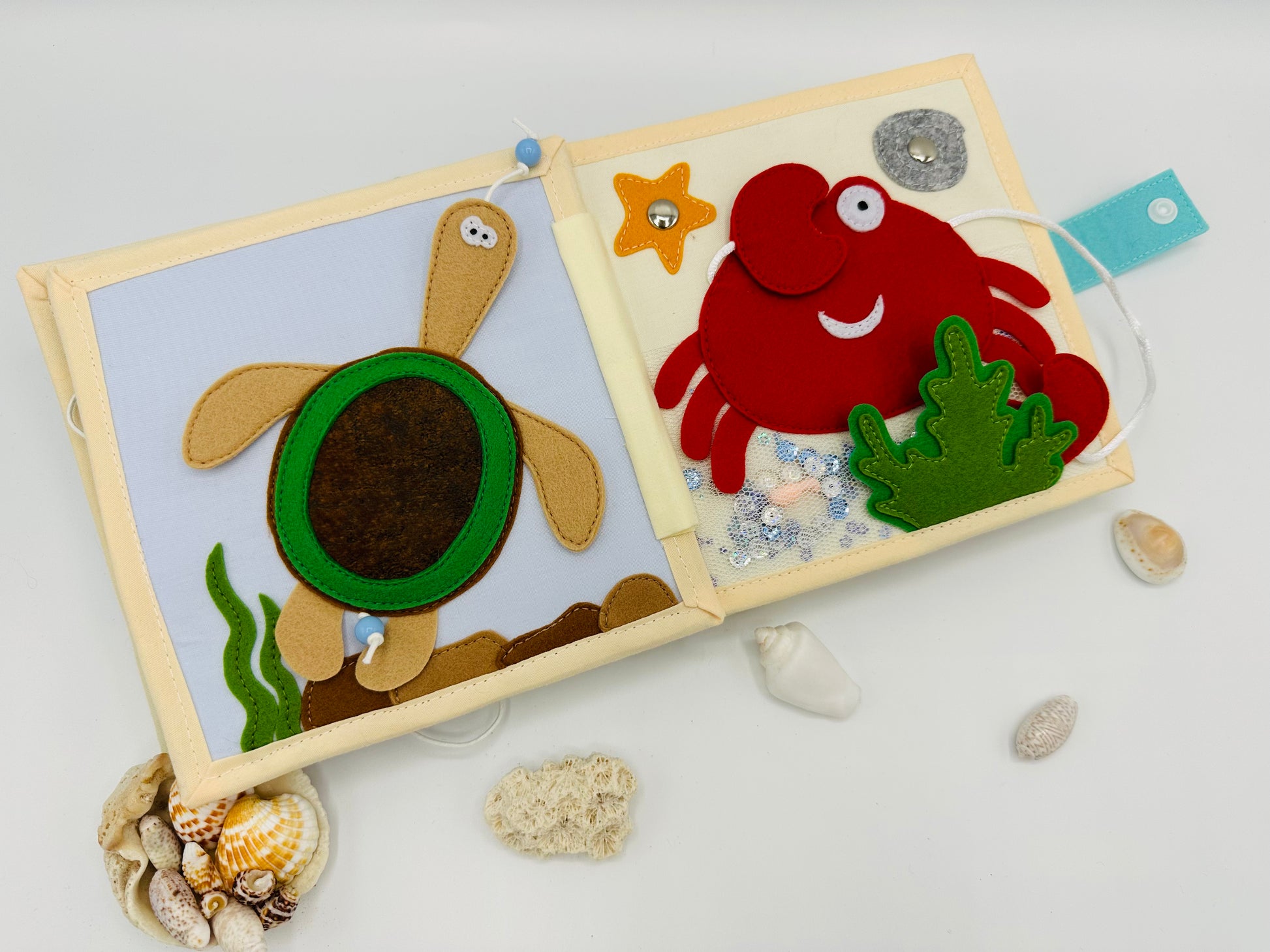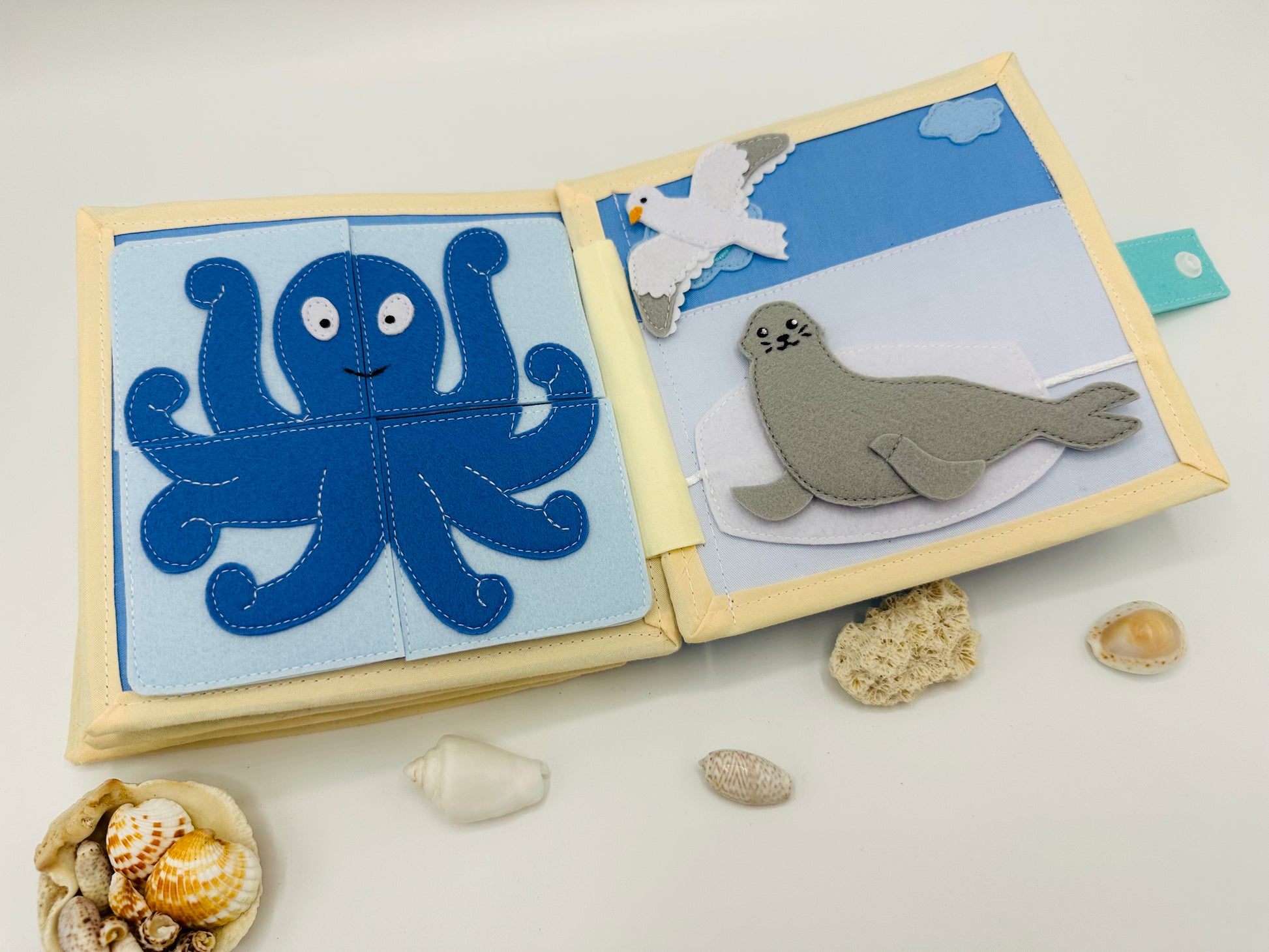 Ruhiges Buch zum Thema Meereswelt erscheint in stilvollen, aufeinander abgestimmten Farben. Optimal für die kleinen Kinderhände. Aus reiner Baumwolle und Filz liebevoll handgefertigt. Die Seiten des Buches sind verstärkt. So wird das Buch lange Jahre dienen und seine Form nicht verlieren. Für Handwäsche geeignet.