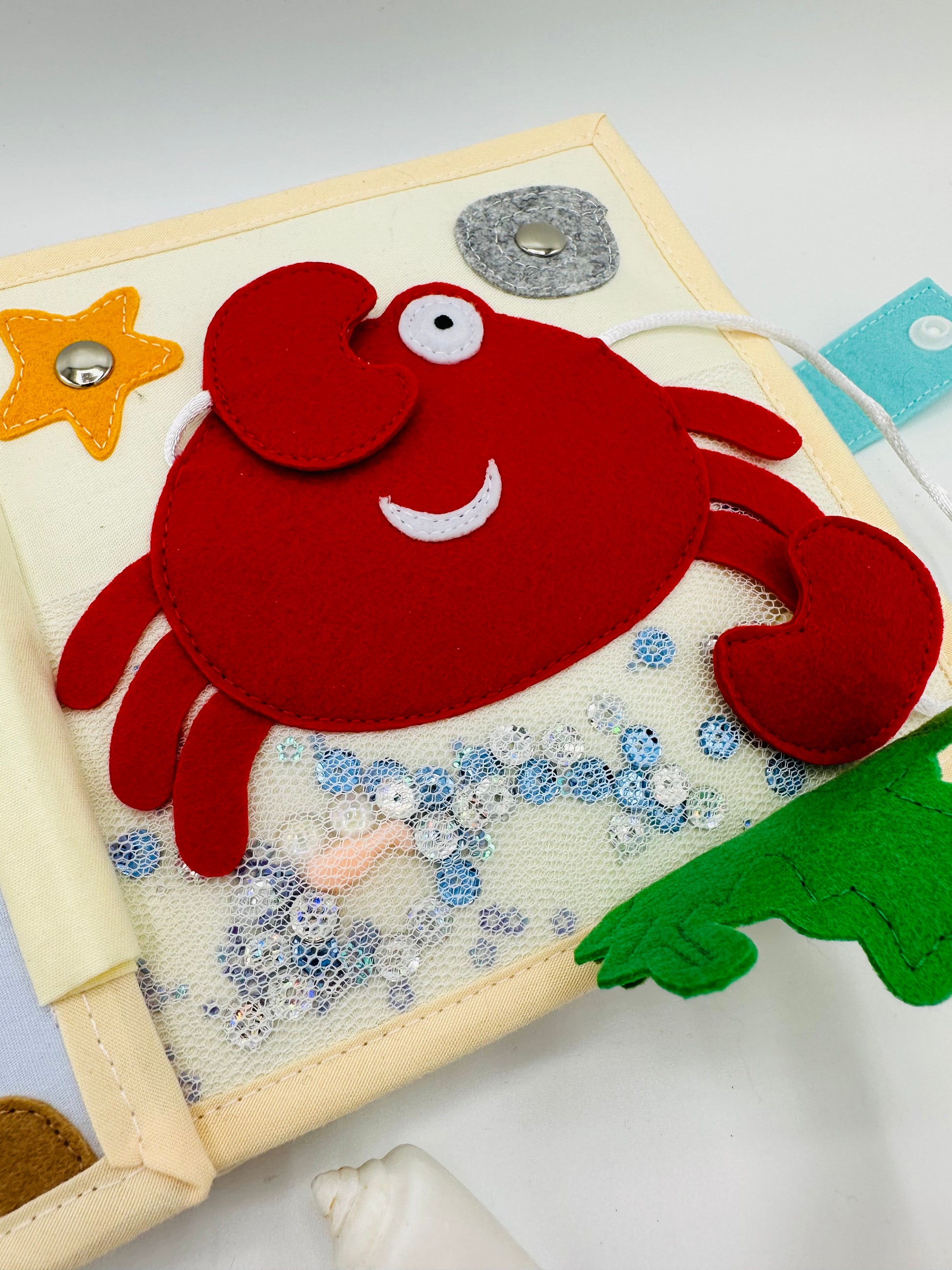 🐠 Mister Krebs und Kuckuck Spiel. Die Krebszangen sind beweglich, mit eingearbeiteten Magneten. Am Meeresboden sind Perlen versteckt. Diese kann man unter dem festen Netzstoff bewegen.
