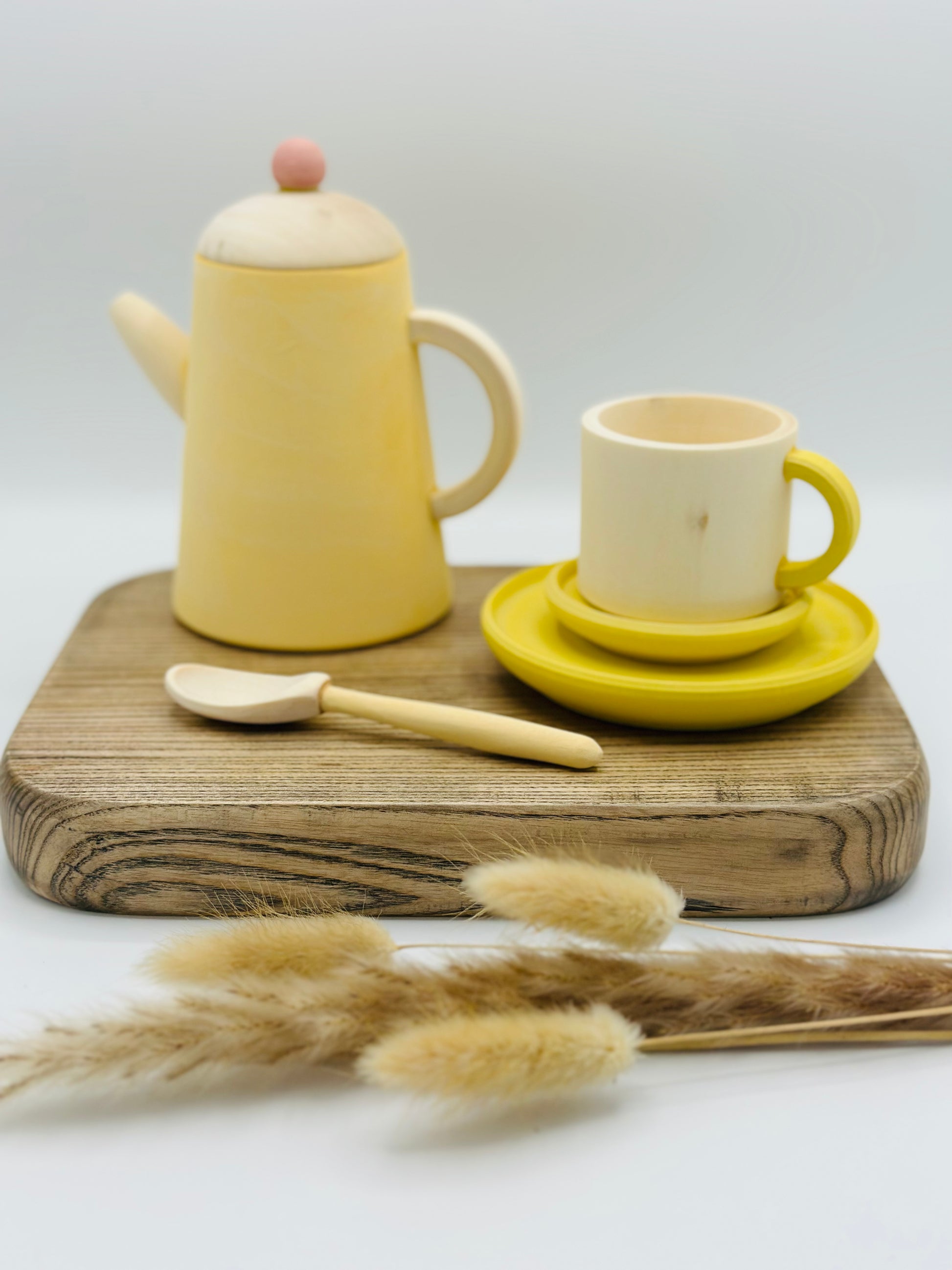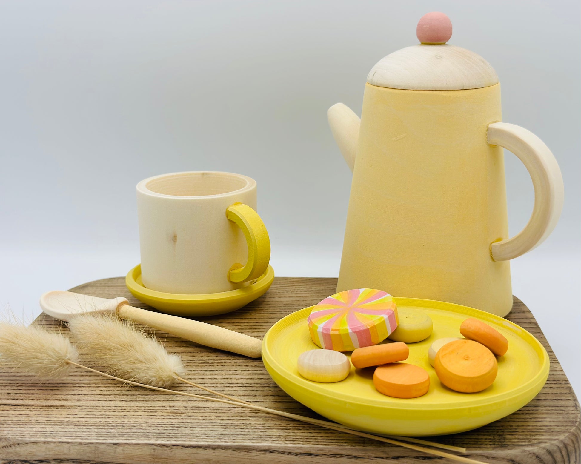 Elegantes Teeservice aus Holz in stilvollen, aufeinander abgestimmten Pastellfarben.